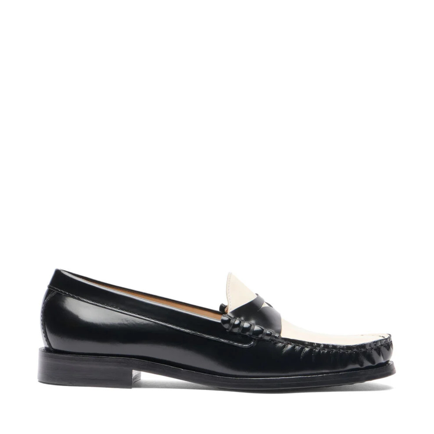 Stuart Weitzaman Black and Cream Lottie Loafers. Black and cream loafers features a gathered design along the toe and a flat block heel, for a comfortable and effortless look.