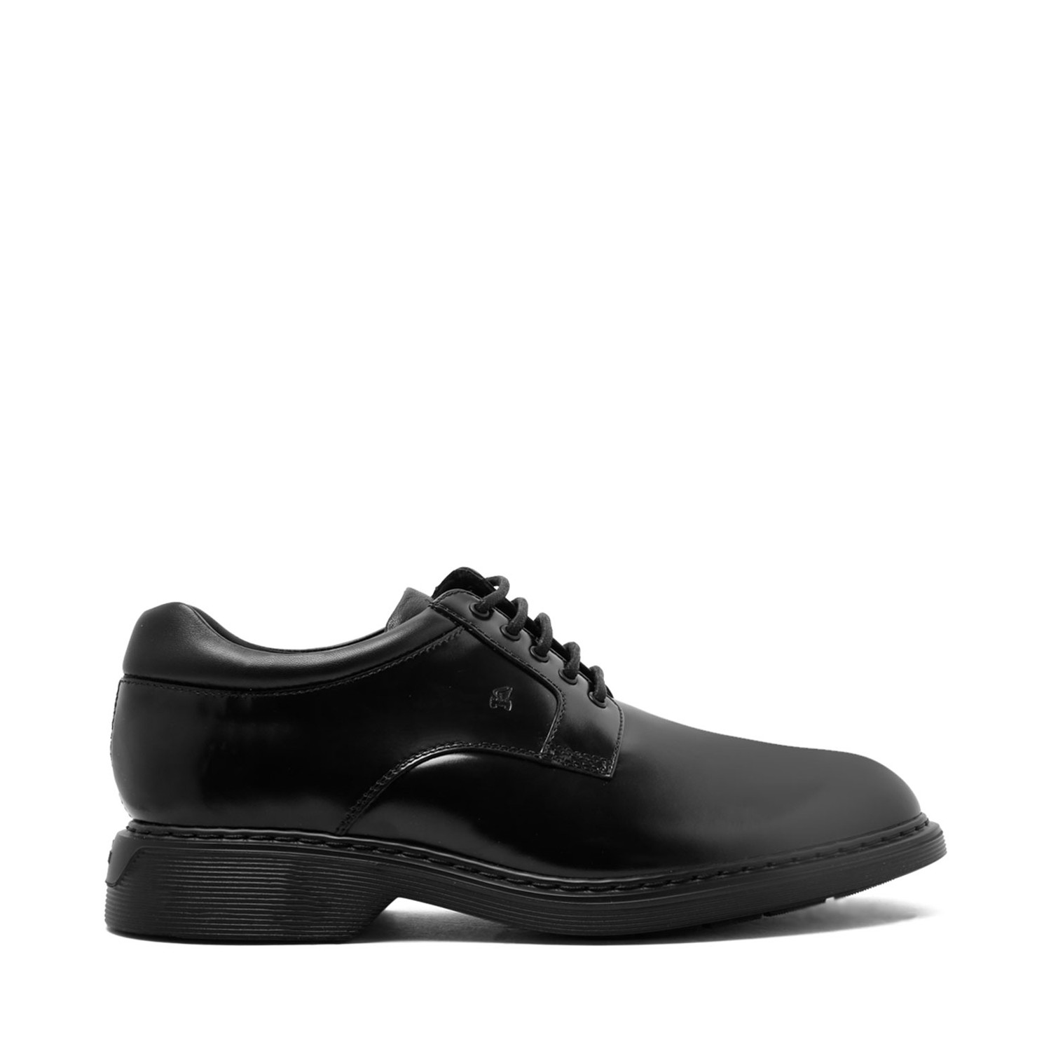 Hogan Black Highlights Leather Derby Shoes. Black leather derby shoes with polished finish, memory foam insole, almond toe. Front lace-up fastening, branded leather insole and rubber sole.