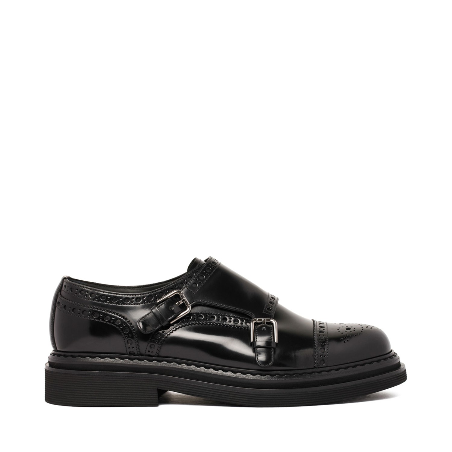 Dolce & Gabbana Black Monk Shoes. Black leather shoes, round toe, branded insole. Buckle fastening and rubber sole.