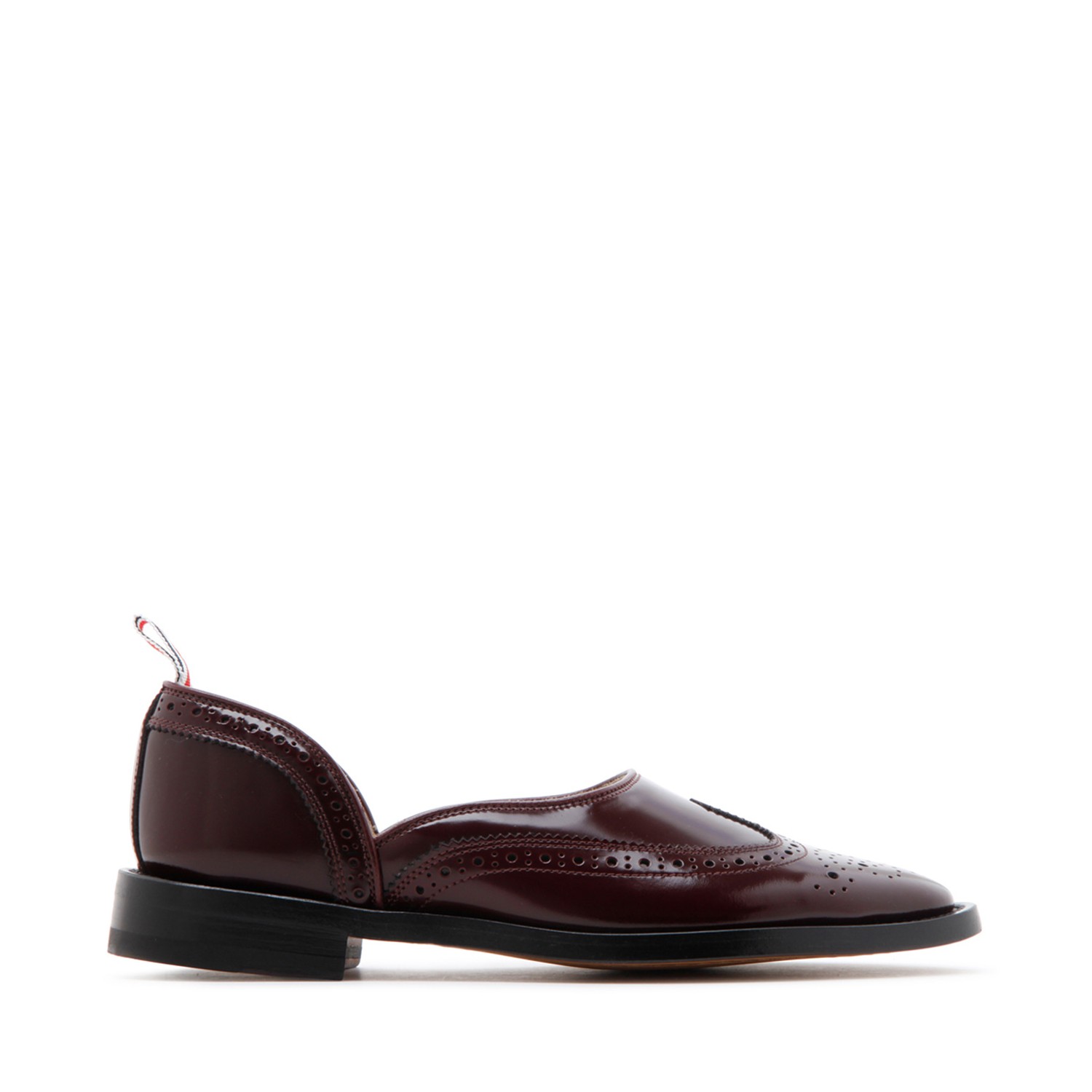 Thom Browne Burgundy Loafers. Burgundy calf leather brogues, perforated embellishment, RWB stripe and almond toe.