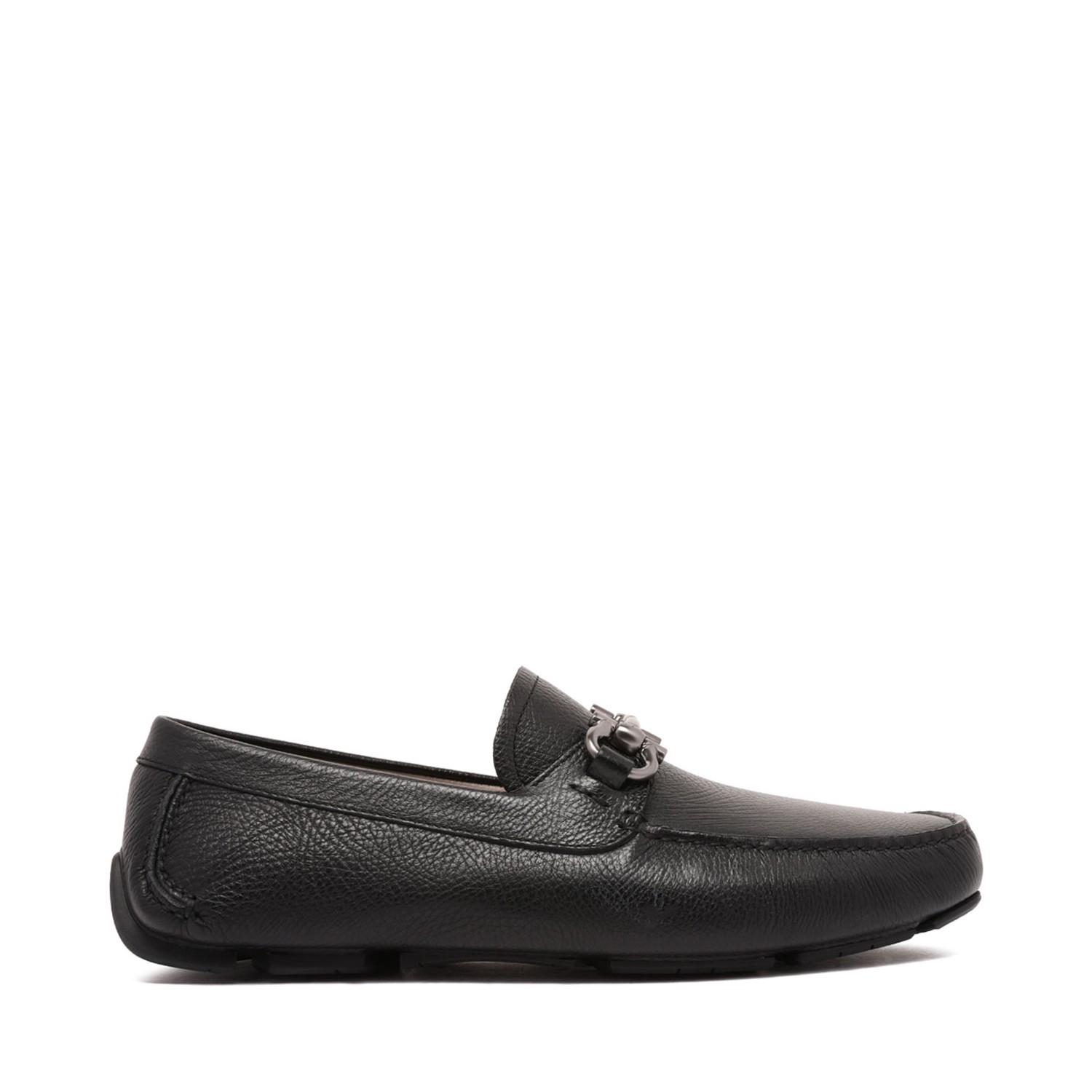 Ferragamo Black Gancini Ornament Driver. These elegant driving shoes are made from hammered calfskin leather with an almost two-tone effect. Adorned with a gunmetal Gancini bit and personalized rubber sole, they are ideal for informal and casual looks. The exquisite tubular construction imparts a soft and lightweight feel, while the traditional hand-crafted upper ensures a refined finish.