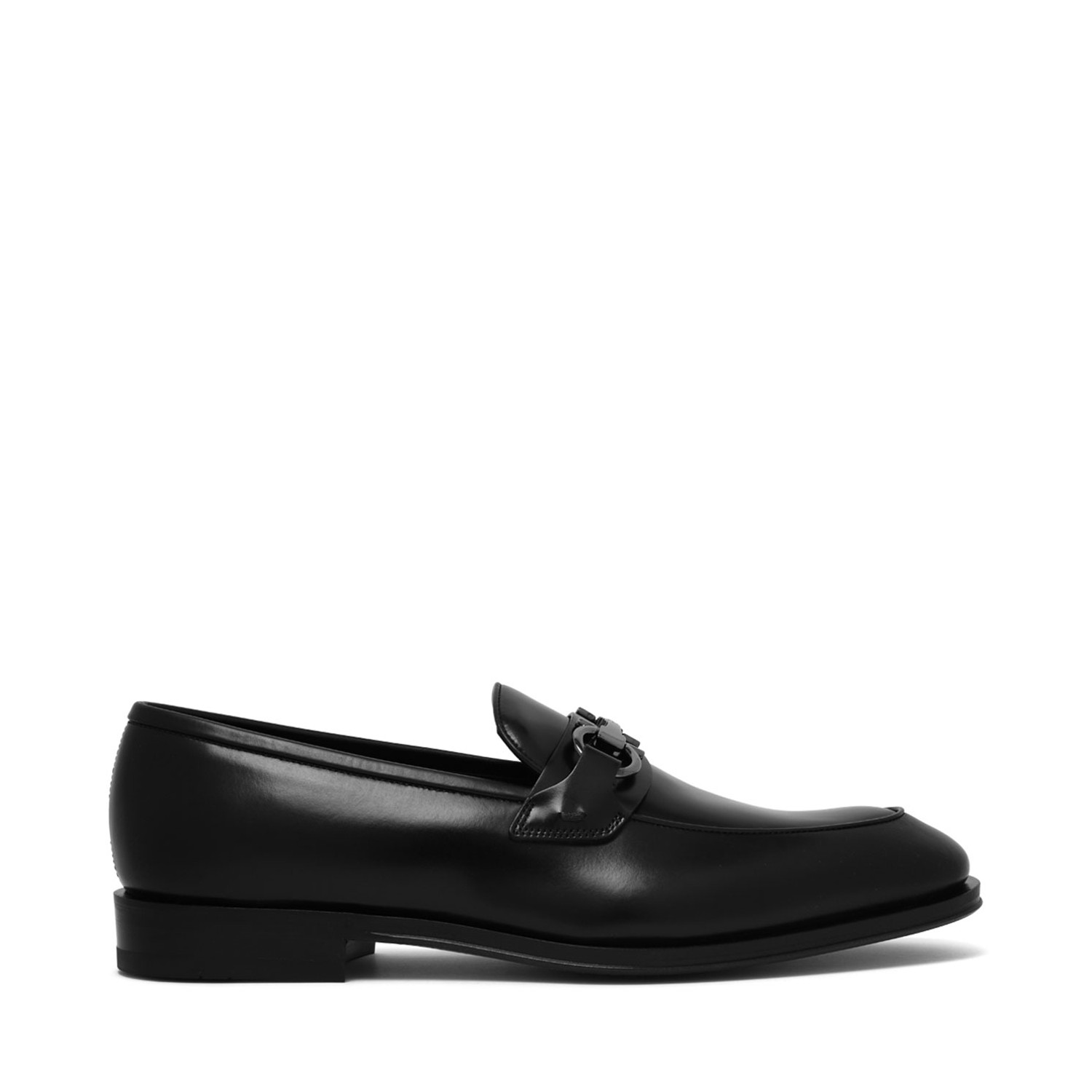 Ferragamo Black Loafer With Gancini Buckle. Black leather loafers with raised stitching around the camp and a slightly elongated tip. The instep is detailed with an equine style Gancini buckle, while the smooth leather upper features a subtle two-tone shading at the toe. This shoe features the Blake construction, whereby the upper is stitched directly to the outsole resulting in a slimmer profile with a more streamlined look and a flexible finish.