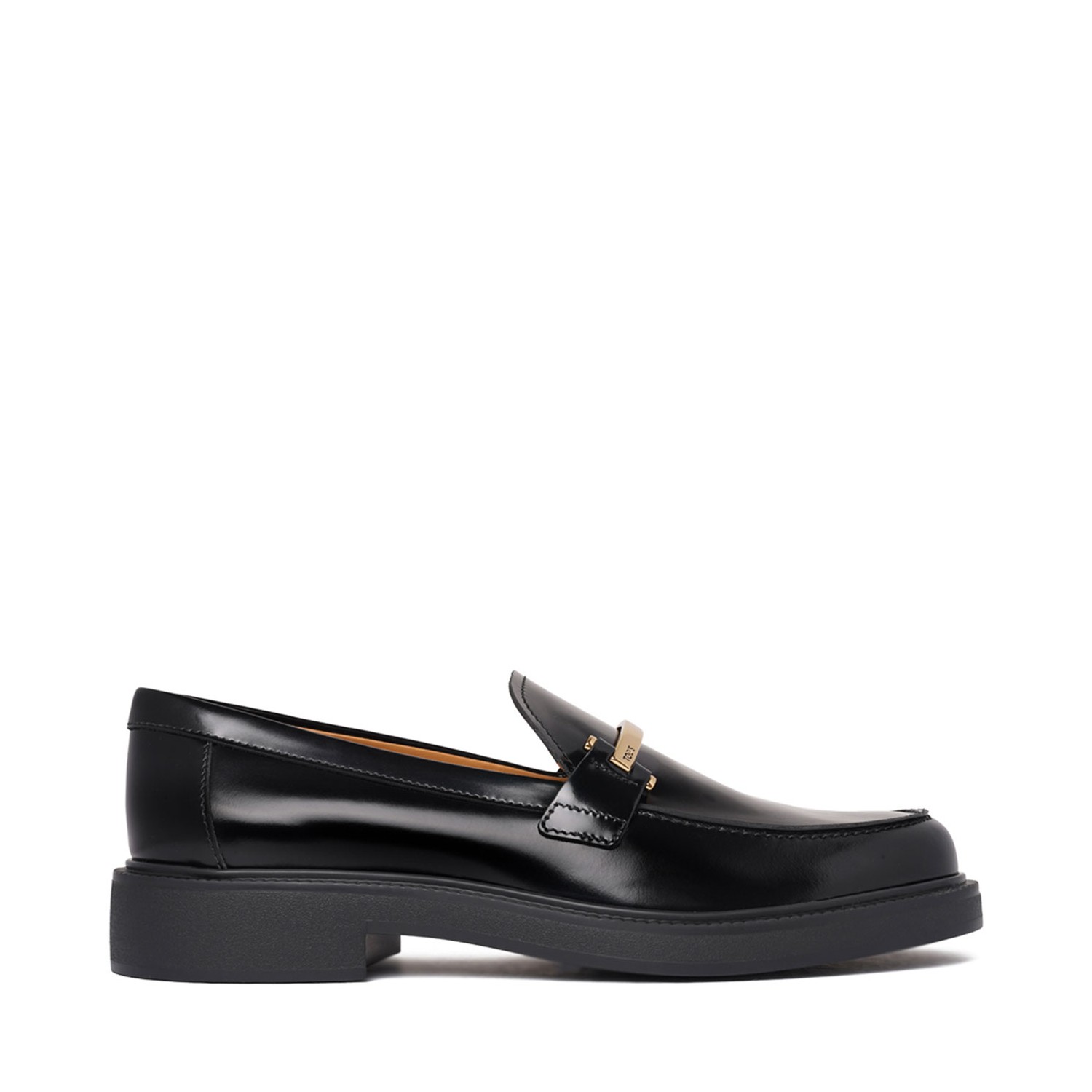 Tod's Black Leather Elegant Moccasins. Black moccasins in elegant brushed calfskin, embellished with a metal bar accessory featuring the Tod's logo on the side. Finished with exposed stitching, they feature a rubber sole with embossed pebbles.