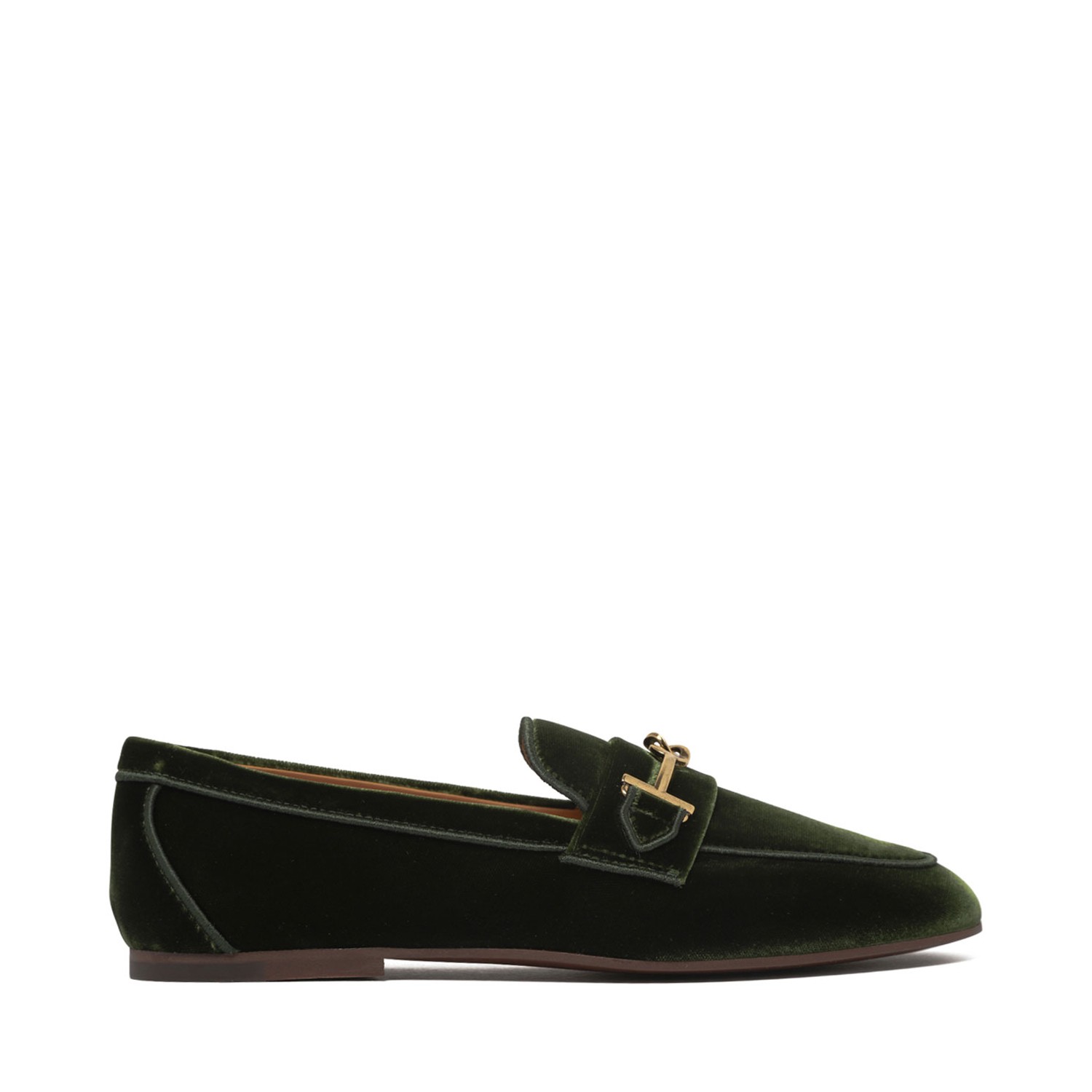 Tod's Moss Green Velvet Loafers. Moss green calf leather and velvet loafers, gold-tone hardware, branded insole, almond toe, slip-on style, flat leather sole.