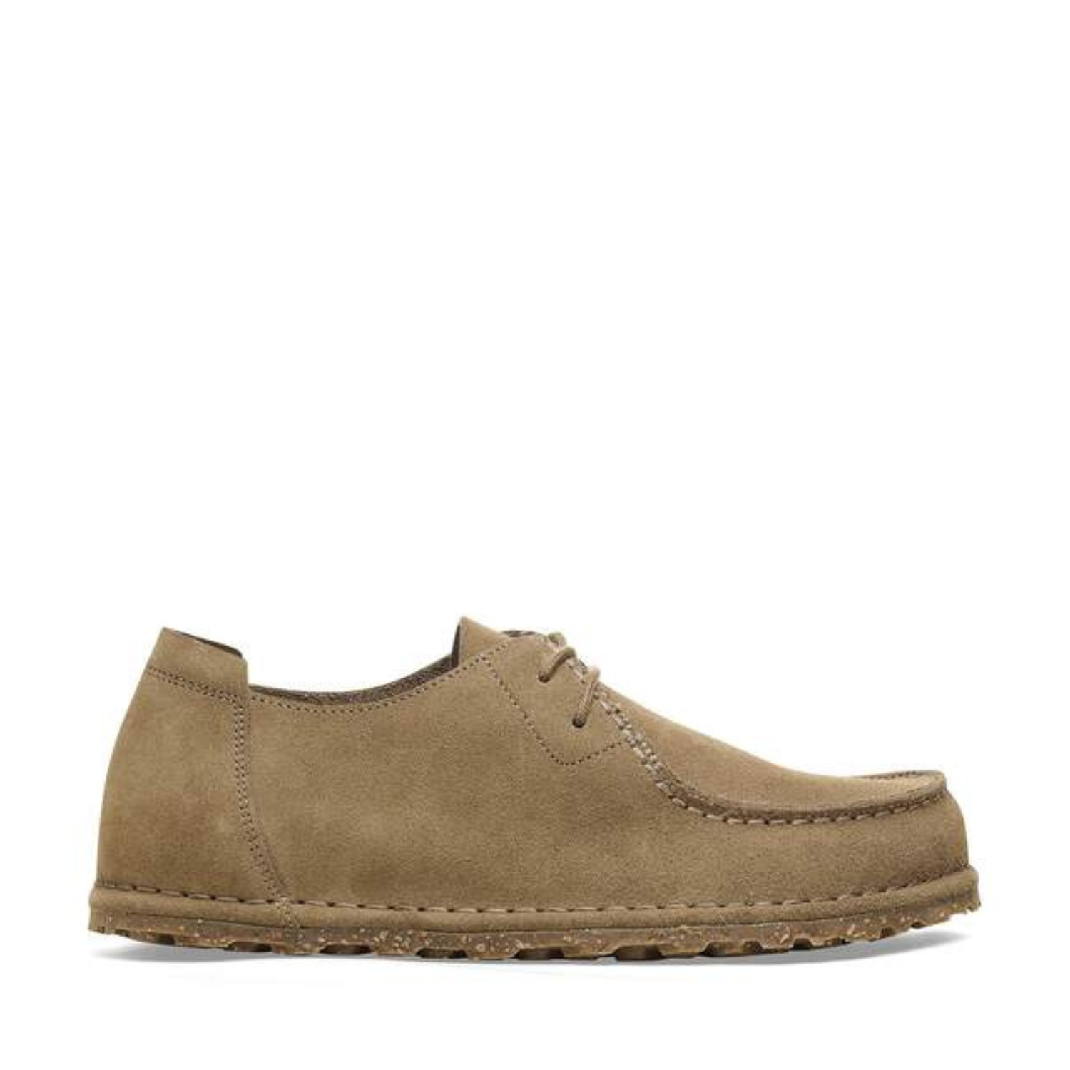 Birkenstock Gray Taupe Utti Lace Moccasin-Style Shoe. Gray taupe moccasin-style shoe with soft heel tab, original BIRKENSTOCK Deep Blue footbed anatomical and removable. Suede leather, natural rubber sole with cork elements, eye-catching stitching and heel tab.