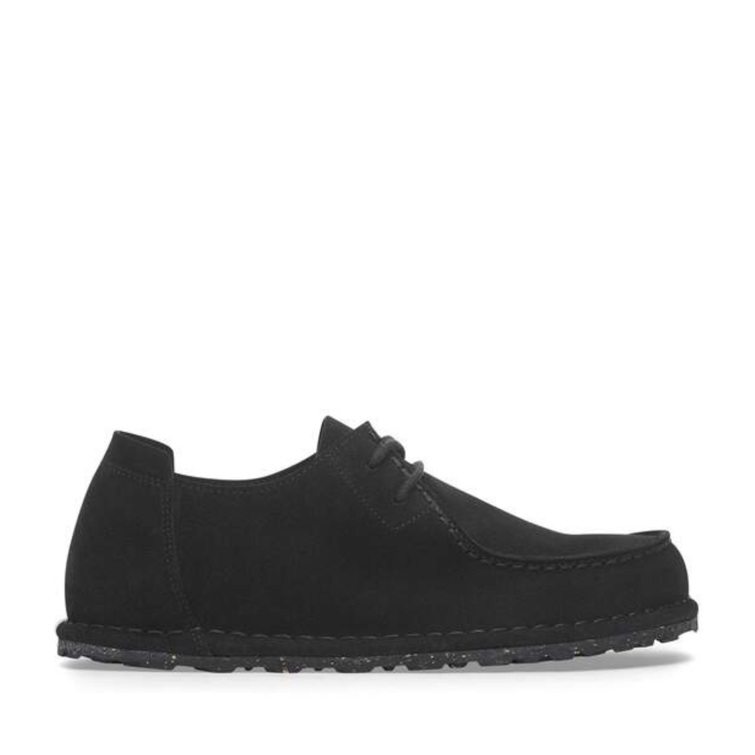 Birkenstock Black Utti Lace Moccasin-Style Shoe. Black moccasin-style shoe with soft heel tab, original BIRKENSTOCK Deep Blue footbed anatomical and removable. Suede leather, natural rubber sole with cork elements, eye-catching stitching and heel tab.