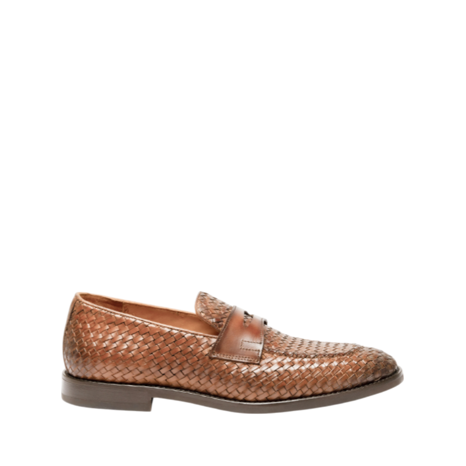 Testoni Brown Woven Leather Tassel Loafers. Brown tassel loafers with a refined, artisanal silhouette. Loafers crafted in premium hand-woven leather featuring an elegant intrecciato texture that enhances depth and craftsmanship. Designed with an almond toe, tonal leather tassels on the vamp and smooth leather trim detail. Completed with a leather-lined interior and low stacked heel, offering timeless sophistication and superior comfort for formal and smart-casual wear.