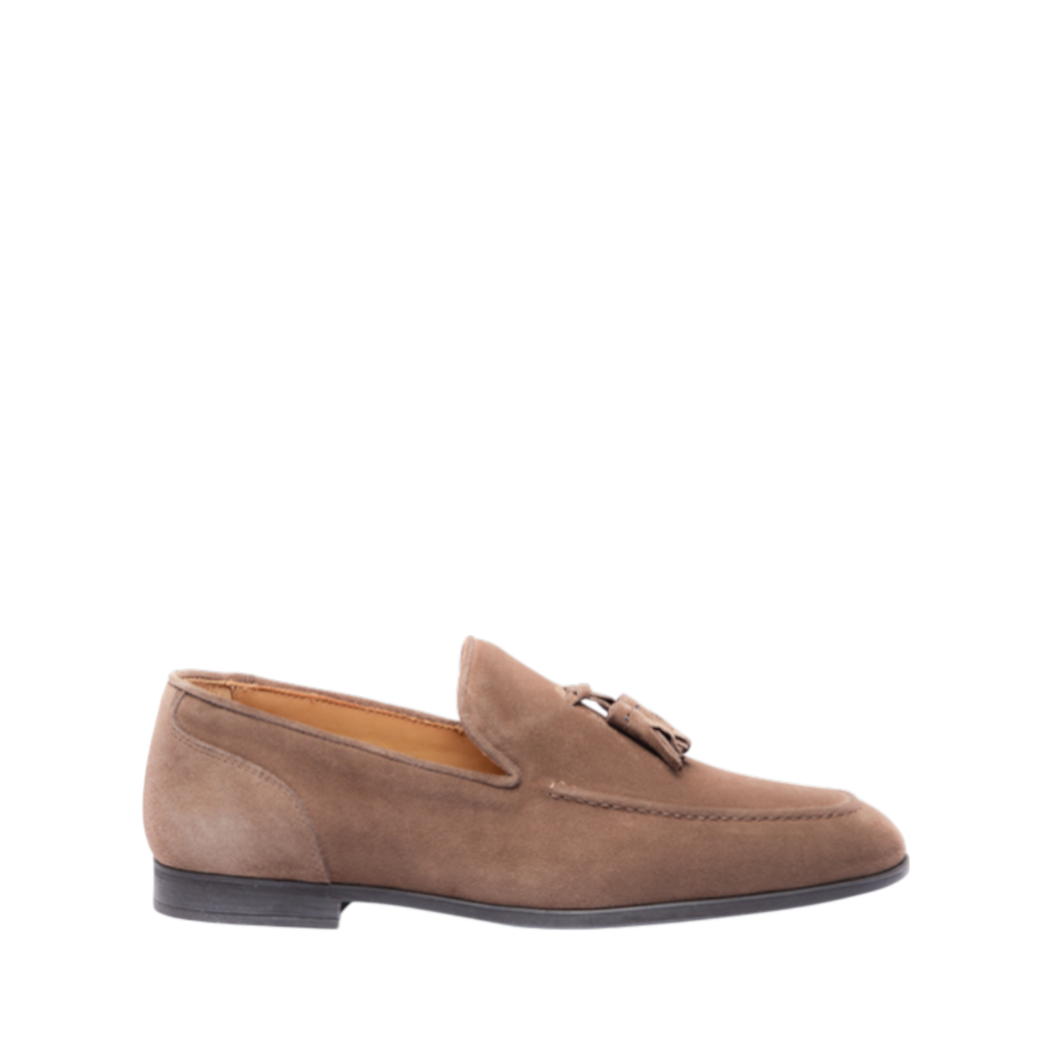 Testoni Brown Suede Tassel Loafers. Brown suede tassel loafers with a refined, timeless silhouette. Loafers crafted in soft premium suede with a smooth, velvety texture and classic apron-toe construction. Featuring tonal leather tassels on the vamp and subtle stitching details that enhance the elegant design. Completed with a leather-lined interior and low stacked heel, offering sophisticated comfort ideal for both formal and smart-casual occasions.