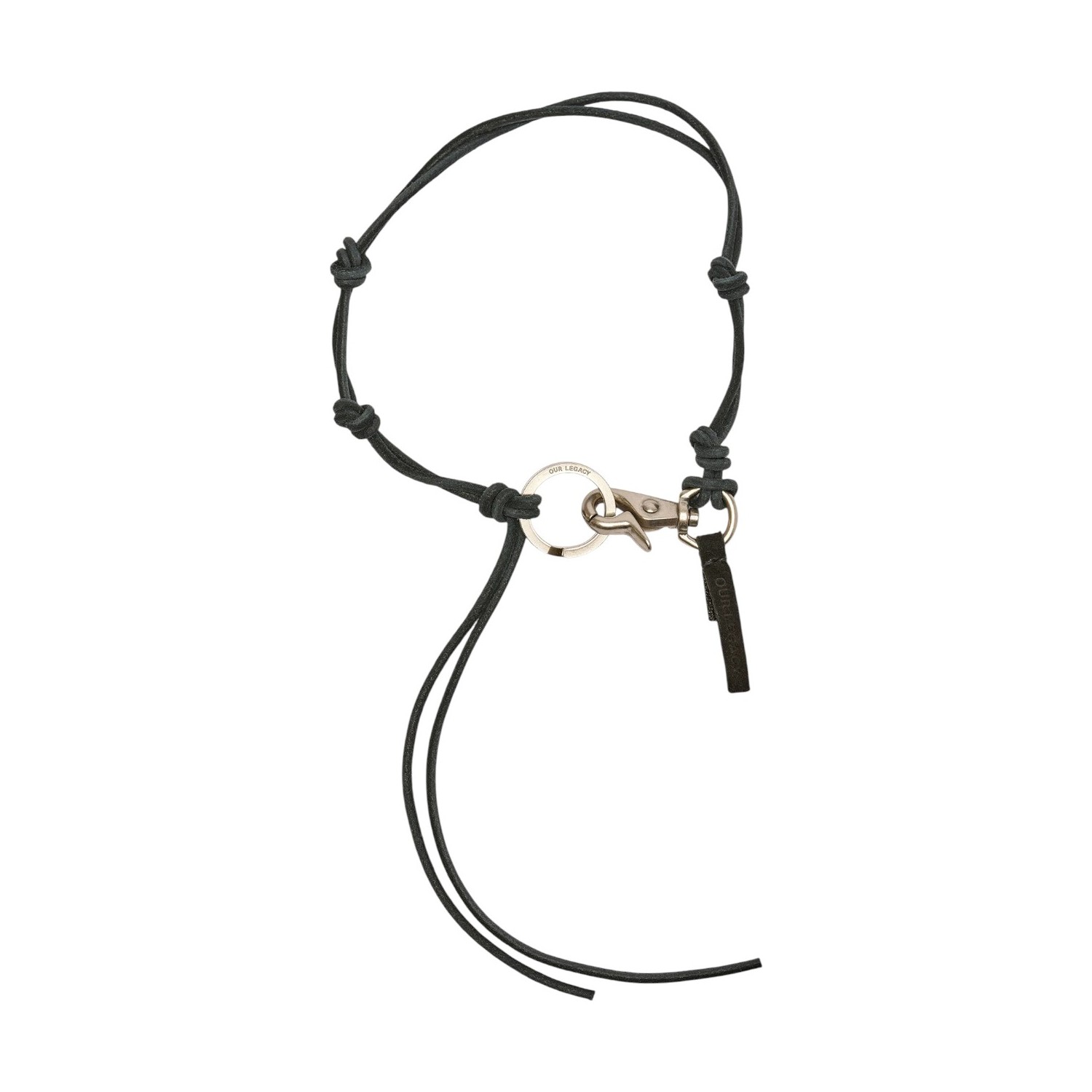 Our Legacy Black Leather Ladon Key Chain. Black key chain with knotted leather cord, Japanese metal hardware, w-ring with engraved OUR LEGACY logo, hand stitched leather tab.