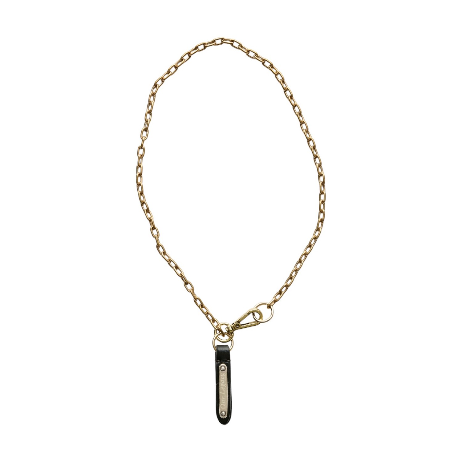 Our Legacy Golden Gubbe Nacklace. Golden Plated brass fine link chain, ring and clip closure, leather tab with Our Legacy engraved metal plate.