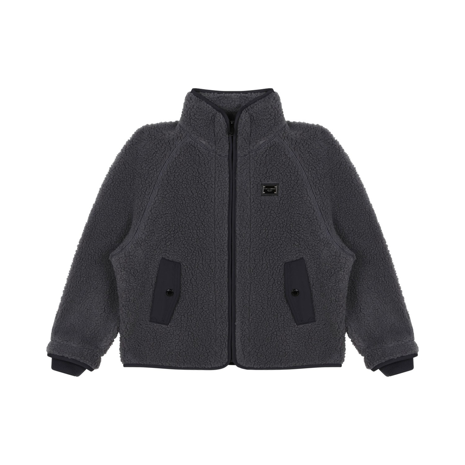 Dolce & Gabbana Kids Anthracite Grey Jacket. Anthracite grey faux fur design jacket, silver tone logo plaque, front zip fastening, stand up collar. Long raglan sleeves, ribbed cuffs, two front welt pockets. Unlined and curved hem.