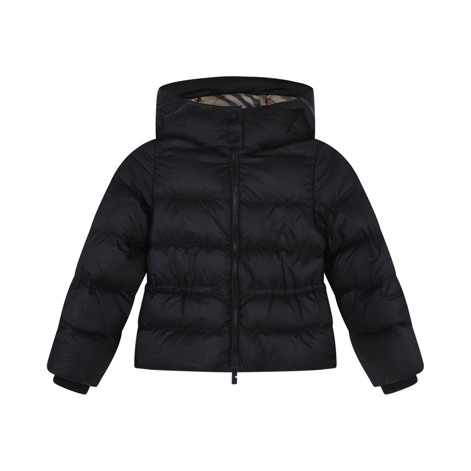 Burberry Kids Black Puffer Jacket. Black puffer jacket with front two-way zip fastening, detachable hood, drawstring waist, ribbed cuffs.