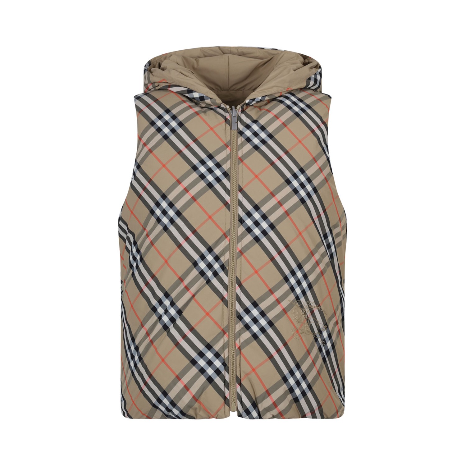 Burberry Kids Reversible Padded Gilet. Beige and multicolour goose down gilet, padded design, check pattern, embroidered logo to the front. Reversible, classic hood, sleeveless, front zip fastening.