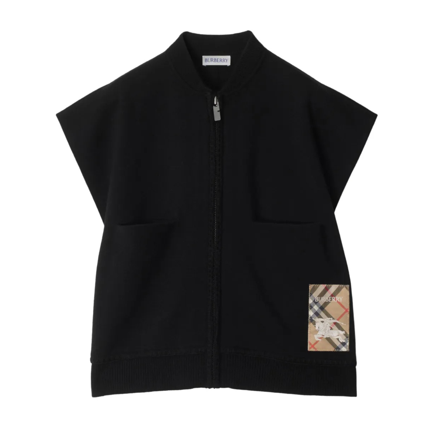 Burberry Kids Check Print Cape. Black wool blend cape with front zip fastening, band collar, sleeveless. Logo patch to the side and straight hem.