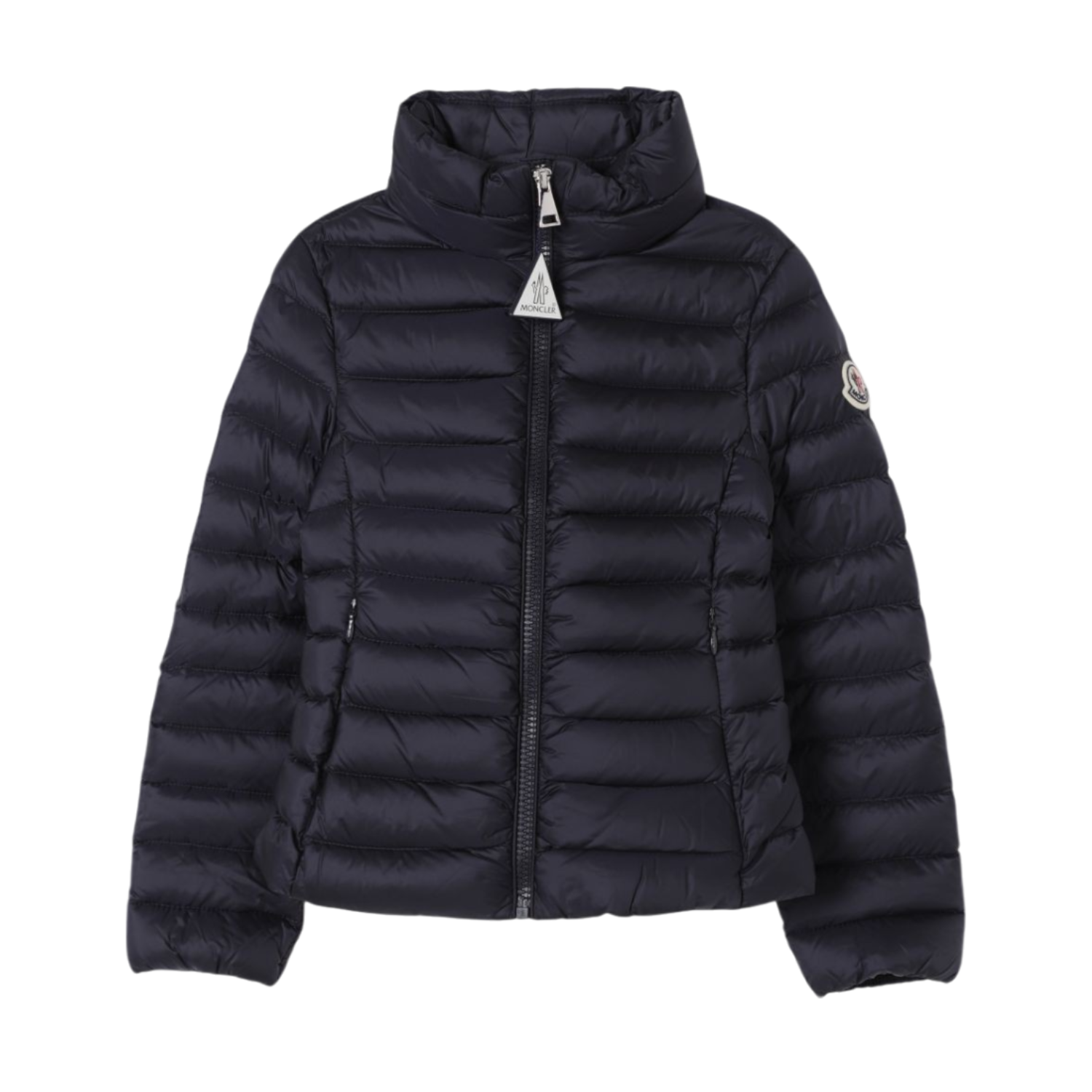 Moncler Kids Navy Blue Padded Down Jacket. Navy blue padded down jacket with front zip up fastening, logo patch to the side, long sleeves, hooded, slit pockets.