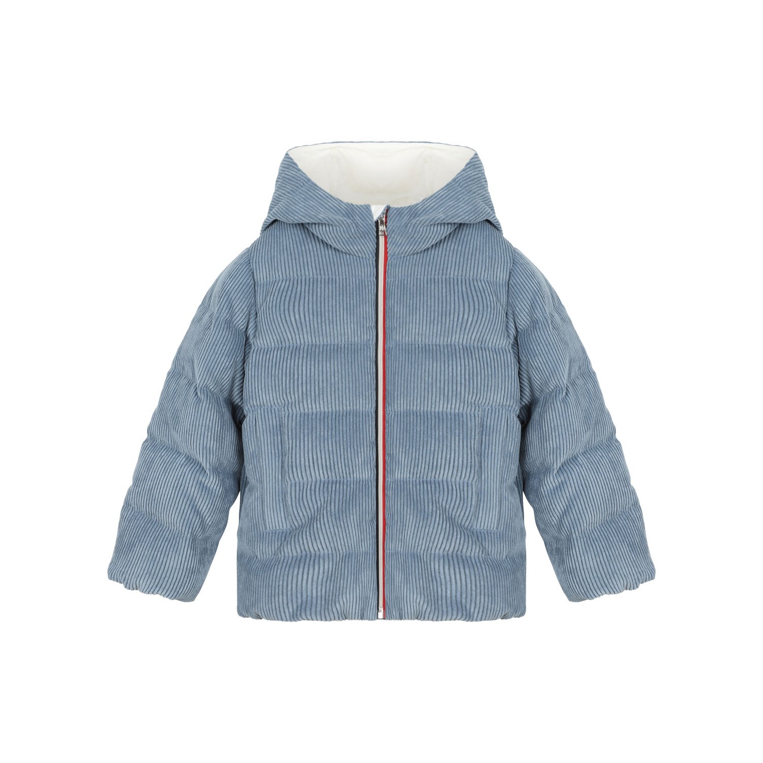 Moncler Kids Puki Blue Down Jacket With Logo. Blue heavyweight corduroy down jacket with long sleeves, a hood, a front zip fastening with red, blue, and white detailing, side pockets with internal buttons, and elasticated cuffs and hem. It features an iconic patch on the sleeve.