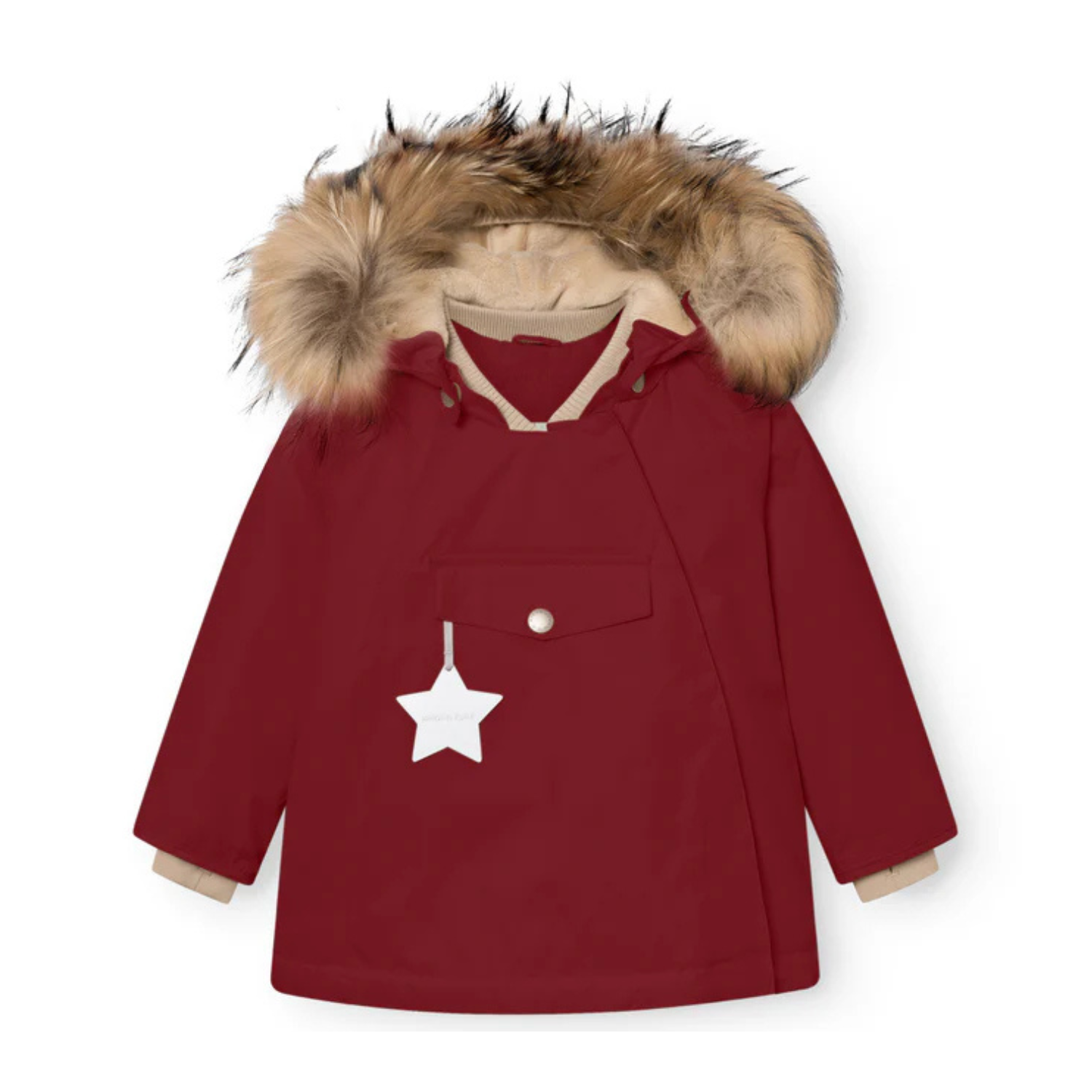 Mini A Ture Red Merlot MATWANG Fleece Lined Winter Jacket. Red merlot conic winter jacket perfect for wind- and waterproof, breathable, and tested to keep warm down to -25 degrees Celsius. The jacket opens at the front.