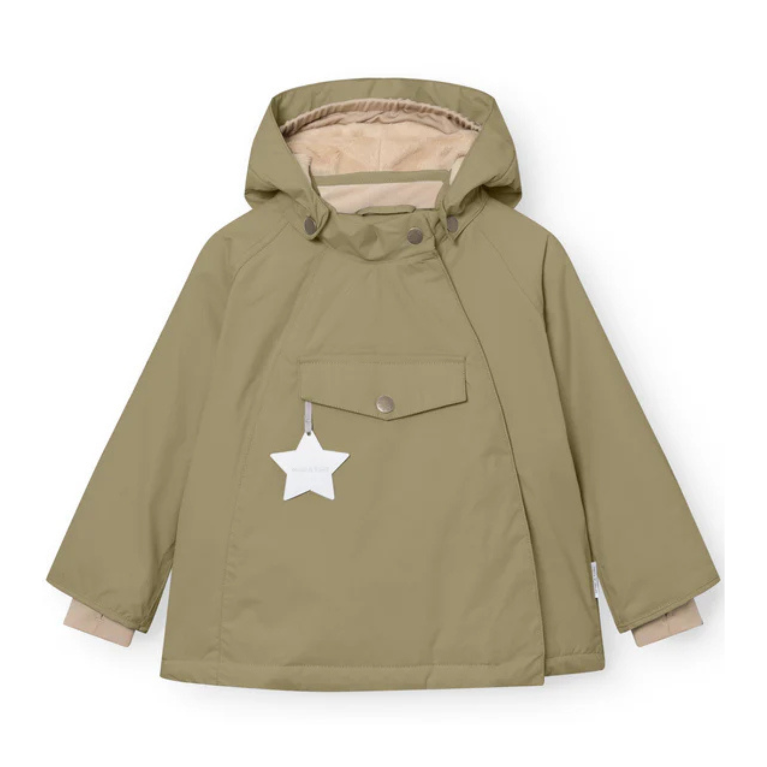 Mini A Ture Aloe Green MATWANG Fleece Lined Winter Jacket. Aloe green Iconic MINI A TURE winter jacket with wind- and waterproof, breathable, and tested to keep warm down to -25 degrees Celsius. The jacket opens at the front by a hidden, slanted zipper and has a soft fleece lining. Featuring a detachable hood that can be adjusted with an elastic string to keep the wind out. The sleeves have improved fitting securing the freedom to move as well as snow cuffs at the wrists with thumb opening. The waist is adjustable from the inside with an elastic. Sizes up to and including 86cm/18m have a rib around the neck, while the larger sizes have a regular collar. MINI A TURE signature reflex star in the front pocket.