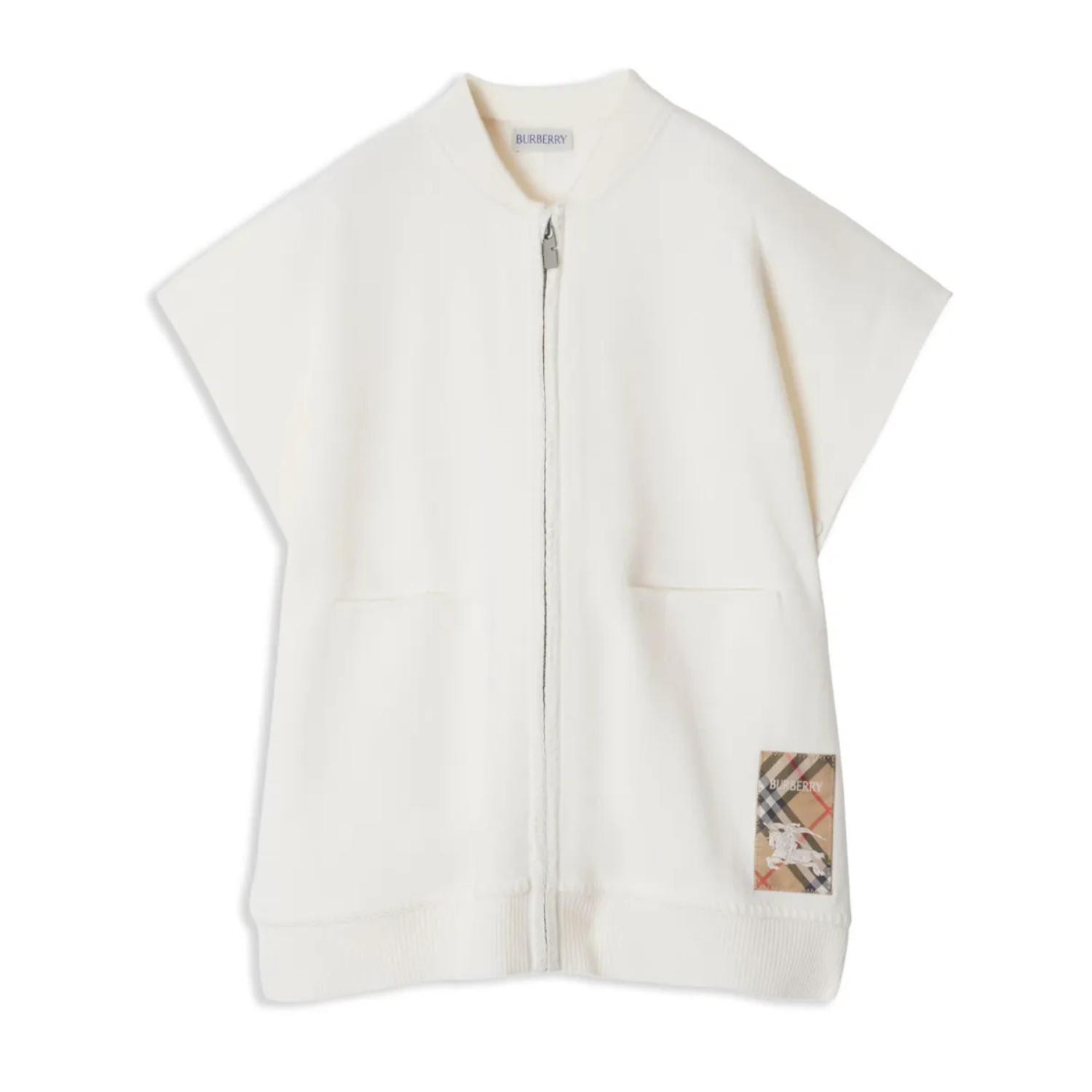 Burberry Kids Ivory Check Print Cape. Ivory wool blend cape with front zip fastening, ribbed band collar, sleeveless. Logo patch to the side, two front patch pockets and ribbed hem.