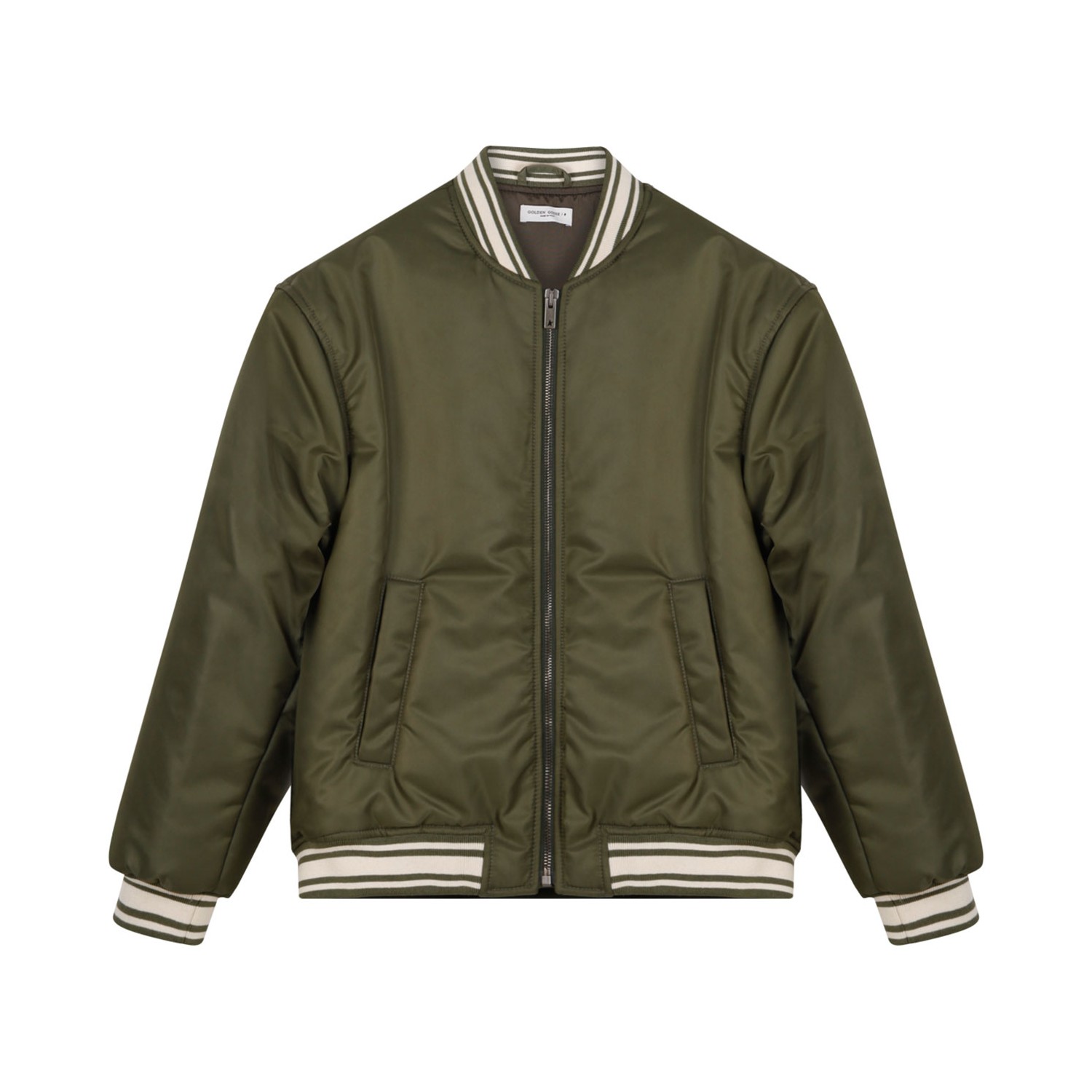 Golden Goose Kids Army Green Bomber Jacket. Army green nylon bomber jacket, double star on the back, striped ribbing on cuffs and collar. Two front pockets, zip closure, Golden writing on the back.