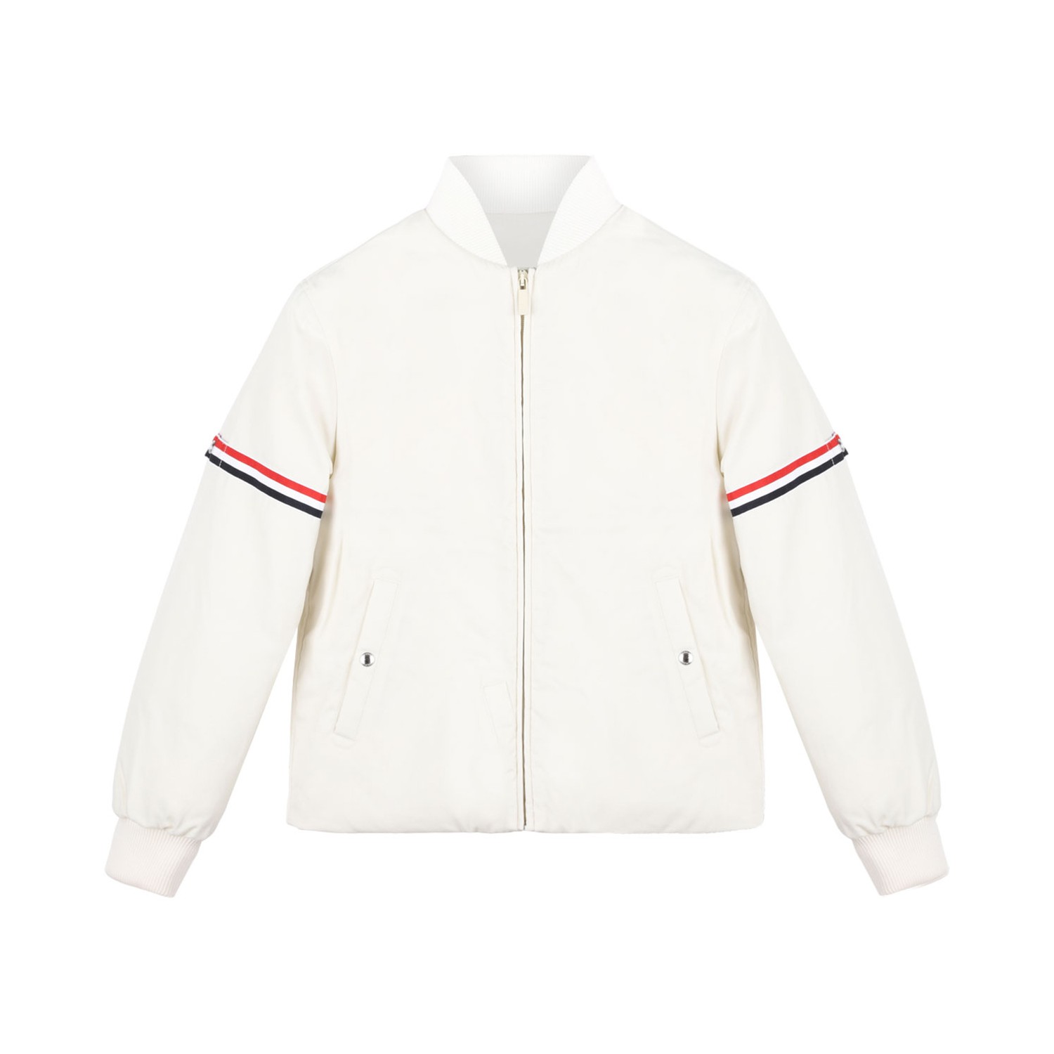 Thom Browne Kids Padded Bomber Jacket. White bomber jacket with RWB stripe, padded design, aseball collar,front button fastening. Long sleeves slip pockets to the sides.