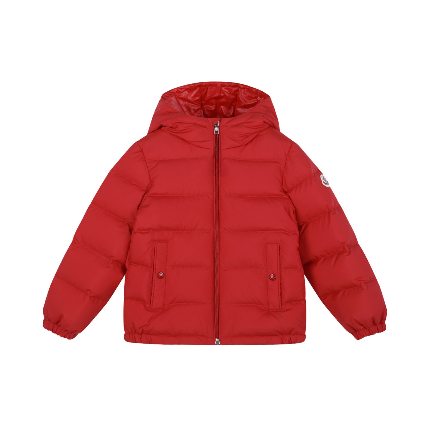 Moncler Kids Red Taidu Down Jacket. Red down jacket wih hood, long sleeves, front zip fastening, logo patch at the sleeve, front pockets.