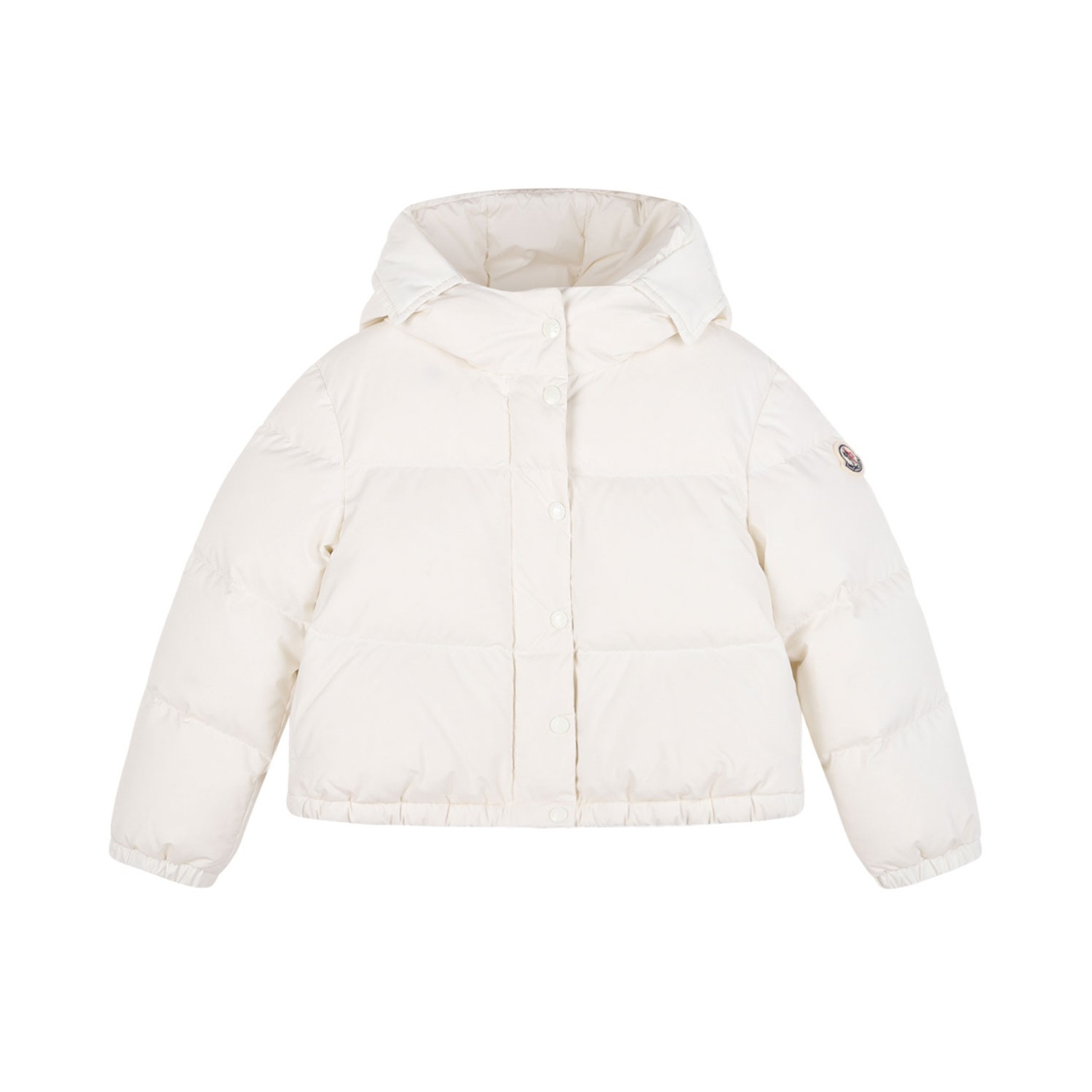 Moncler Kids Dark Pink Laurie Padded Jacket. Dark pink padded jacket with hood, front button fastening, logo patch at the sleeves, high neck.