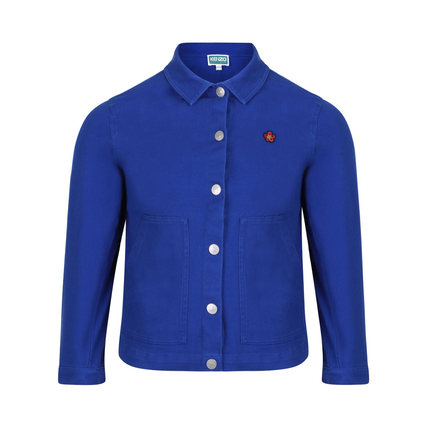 Kenzo Kids Electric Blue Logo Embroidered Jacket. Electric blue cotton blend jacket with logo patch at the chest, embroidered logo to the rear, classic collar. Snap-fit fastening, two front patch pockets, long sleeves and straight hem.