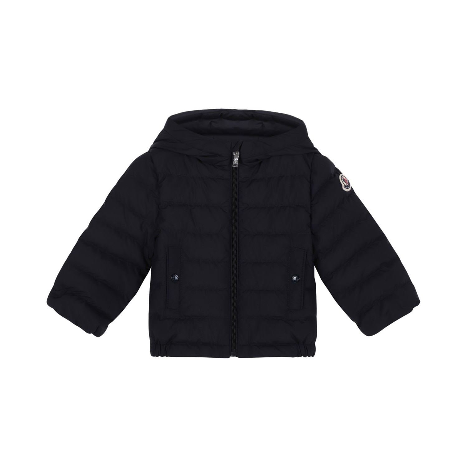 Moncler Kids Dark Blue Down Jacket With Logo. Dark blue down jacket in smooth technical fabric with regular horizontal quilting. It features a soft, fixed hood, an exposed zip front closure, and elasticized cuffs and hem to help retain heat without weighing you down. Front pockets with flaps and snap buttons add a functional detail while maintaining a clean line. The classic felt logo patch stands out on the sleeve, while the hood is finished with a subtle tricolor ribbon that recalls the brand's codes.