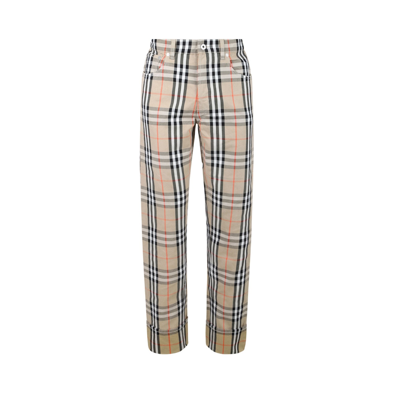 Burberry Check Print Trousers. Archive Beige cotton and canvas trousers, Burberry Check pattern. Button fly fastening, belt loops, classic five pockets, leather tag, turn-up hem.