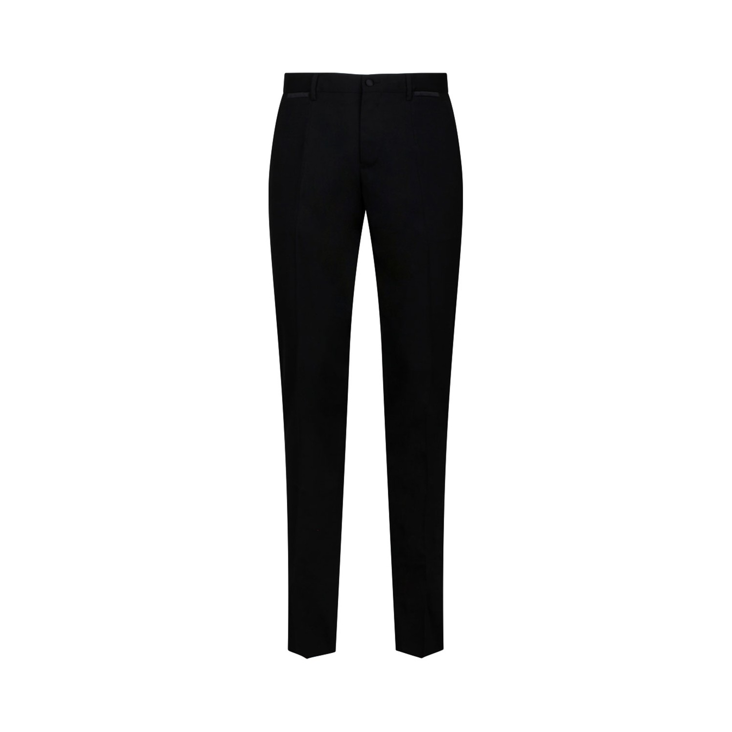 Dolce & Gabbana Black Tailored Pants. Black tailored stretch wool tuxedo pants, silk duchesse details and side bands. Belt loop on the waist, fly covered zipper and button fastening, front slant pockets and buttoned welt pockets at the back.