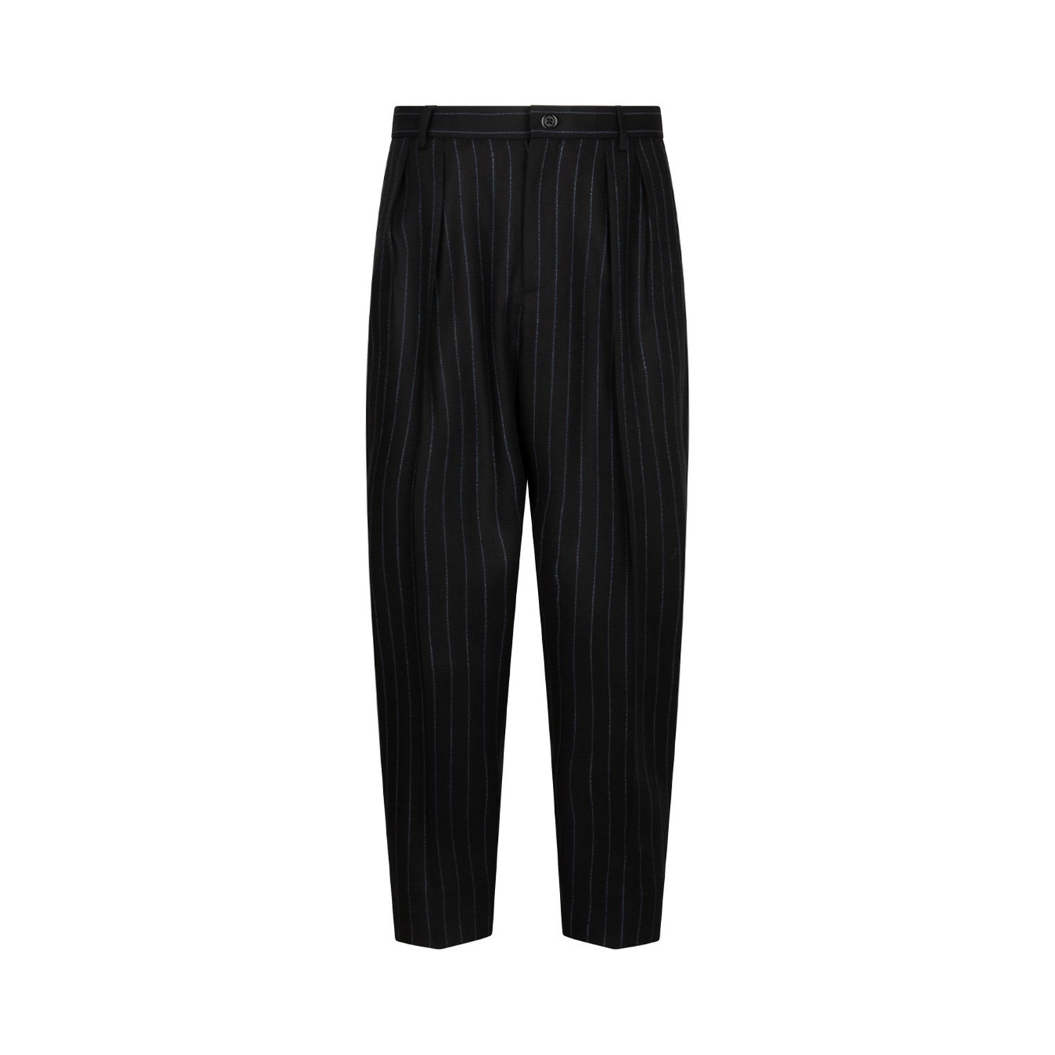 Dolce & Gabbana Black Pinstripe Pants. Black tailored pinstripe wool pants, belt loops on the waist, fly covered zipper and button fastening. Double darts, front slant pockets and buttoned welt pockets at the back.
