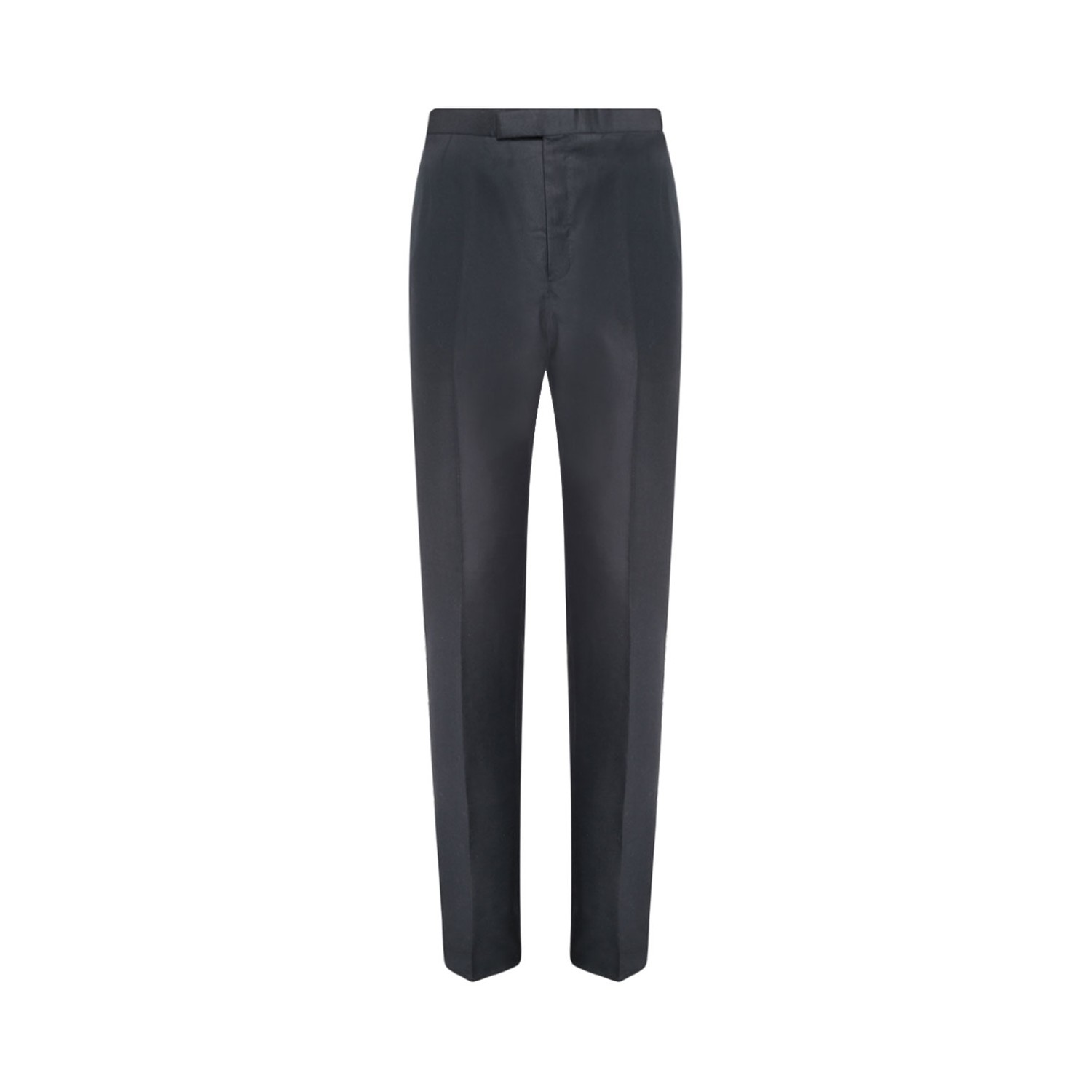 Thom Browne Navy Tailored Trousers. Navy wool tailored trousers, adjustable buttoned strap to the back of the waist height, concealing the unforgettable grosgrain tab. Mid rise waistband, side slit pockets, two back buttoned welt pockets, a cropped length to a straight hem, a straight leg and a concealed button.