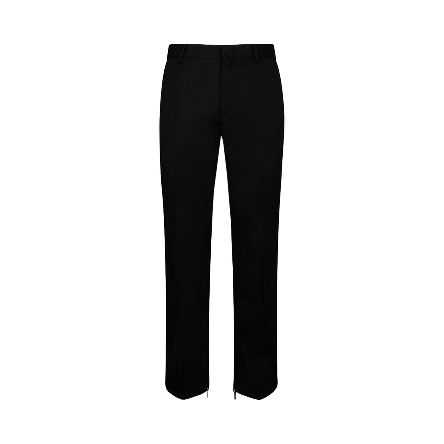 Off White Black Trousers. Black wool trousers, hook and zip closure, belt holes, leg crease. Side pockets, back pockets, zipped hem splits.