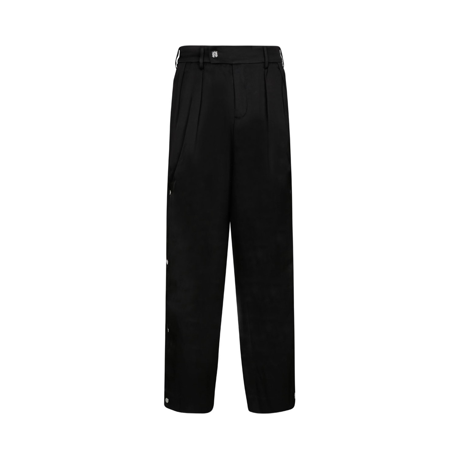 Amiri Side Pleats Black Pants with press studs. Button and zip fly with button slightly shifted to the right. Belt loops.