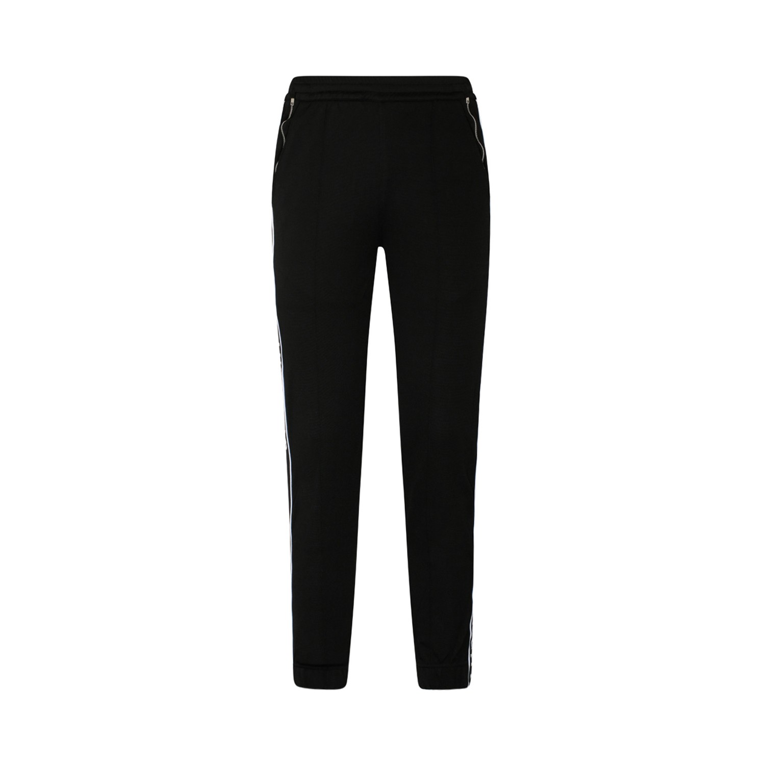 Givenchy Black Jersey Logo Bands Joggers. Black jersey joggers, logo bands along the sides, elasticated waistbands. Drawstring fastening, side zip pockets, central rib, elasticated hem.