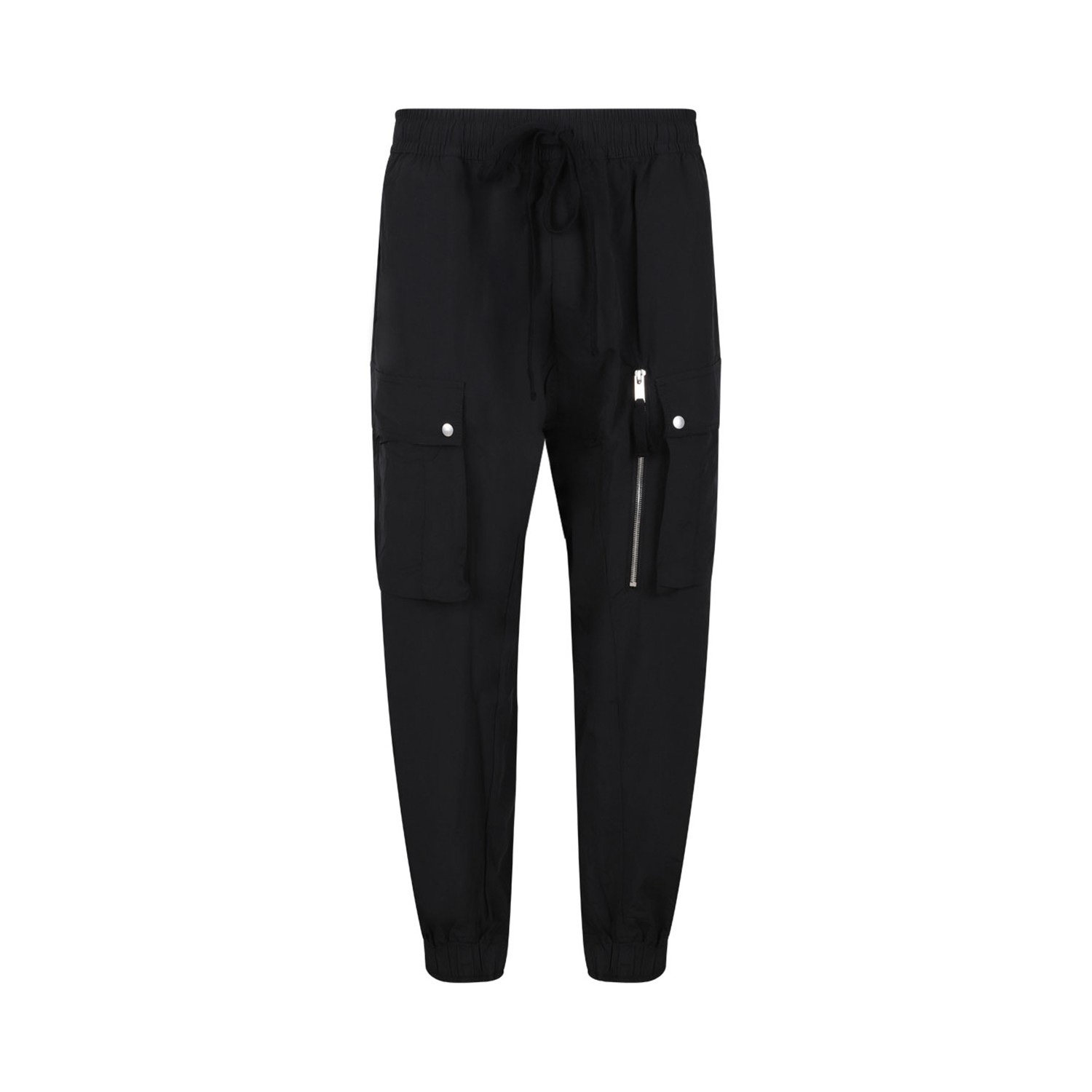 Thom Krom Black Elasticated Waist Cargo Trousers. Black elasticated-waist cargo trousers with drawstring closure, side pockets, zip pockets and snap button detailing.