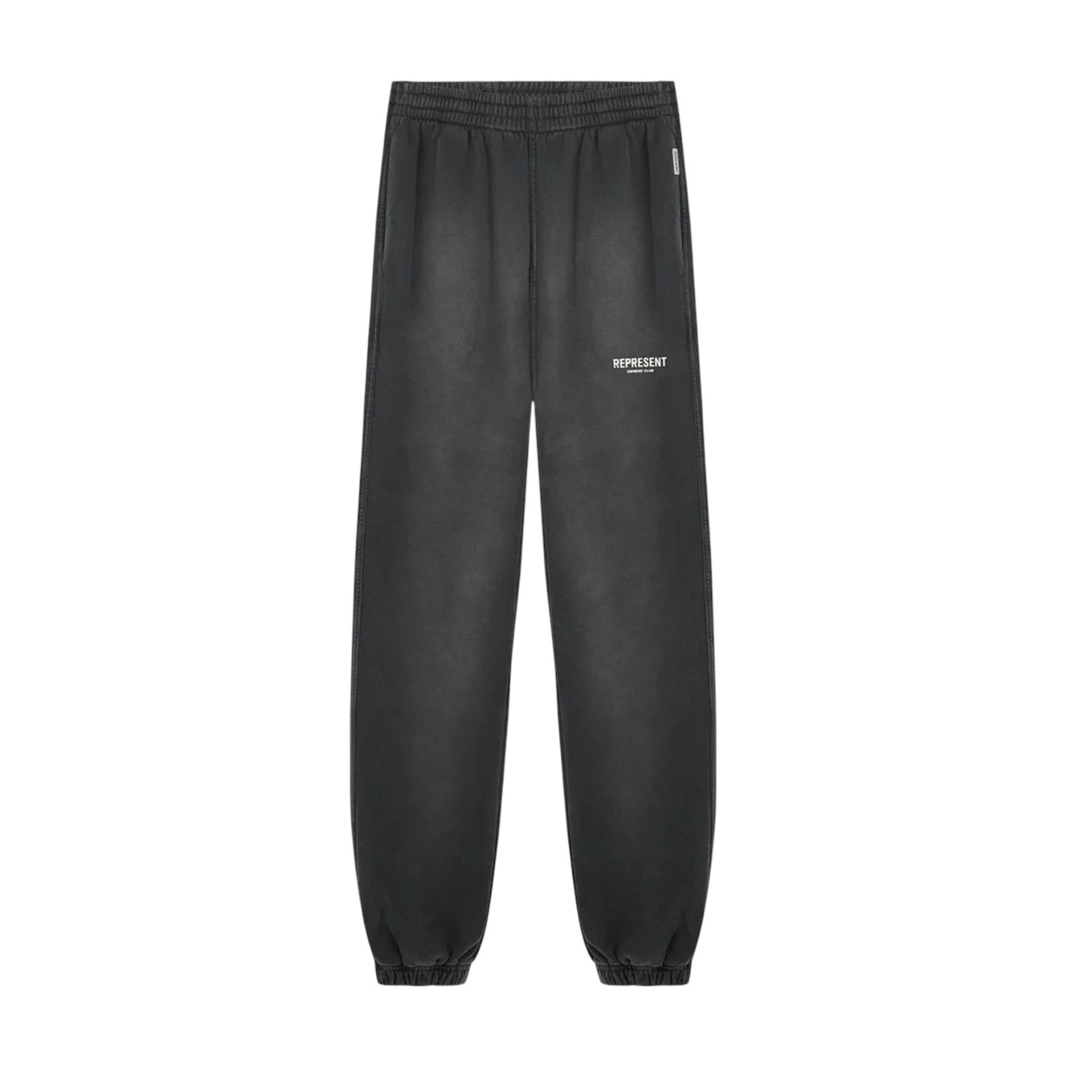 Represent Aged Black Owners Club Sweatpants. Aged black sweatpants crafted from cotton and cut to a relaxed fit, these joggers feature an elasticated waistband with an internal drawstring, rear patch pocket, and dual front pockets. Finished with Owners' Club logo branding to the left of the leg.