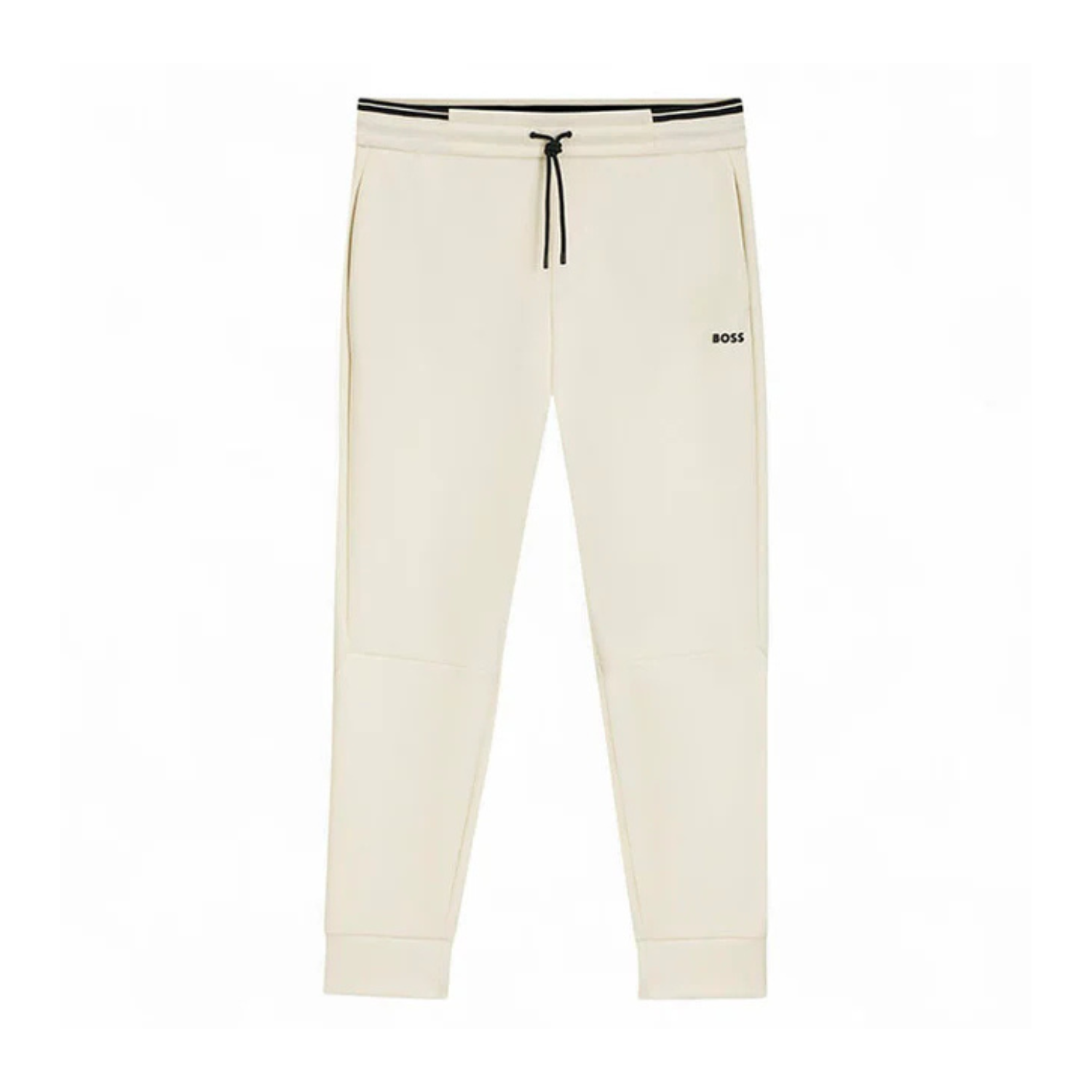 Boss Green Open White Sweatpants With Embossed Logo. Open white cotton sweatpants with embossed logo, elasticated drawstring waist, two side welt pockets and back welt pocket.