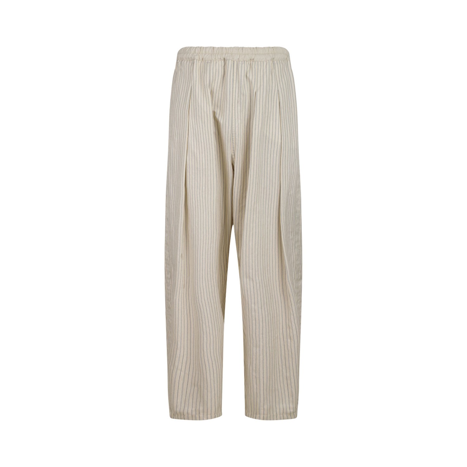 Maison Margiela Light Beige Pinstripe Trousers. Light beige cotton trousers, pinstripe, elasticated waistband, two side slit pockets. Rear patch pocket, pleat detailing.