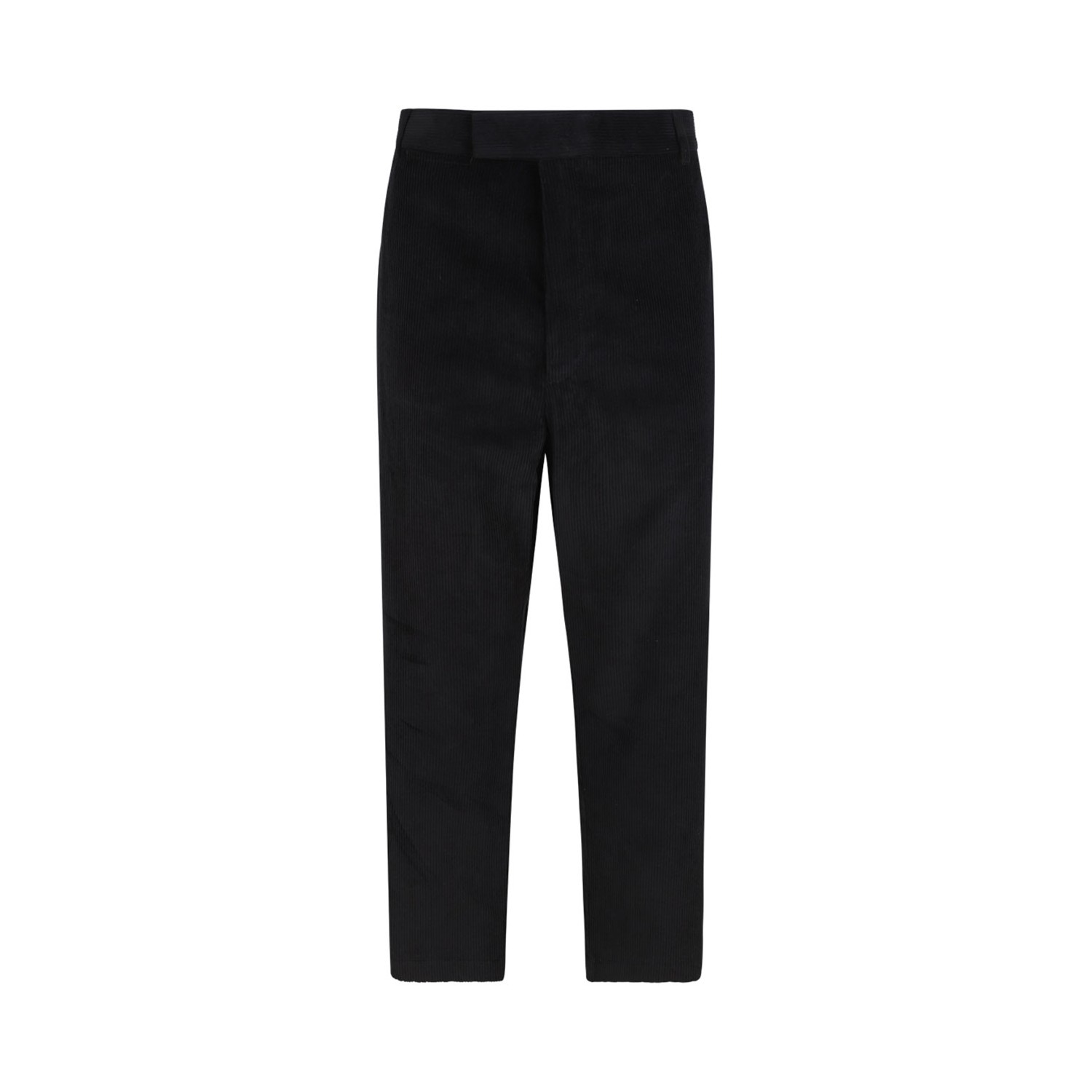 Thom Browne Black Corduroy Unconstructed Trousers. Black corduroy trousers with tab front closure, slip side pockets. Button-fastening back welt pockets, Signature striped grosgrain loop tab.