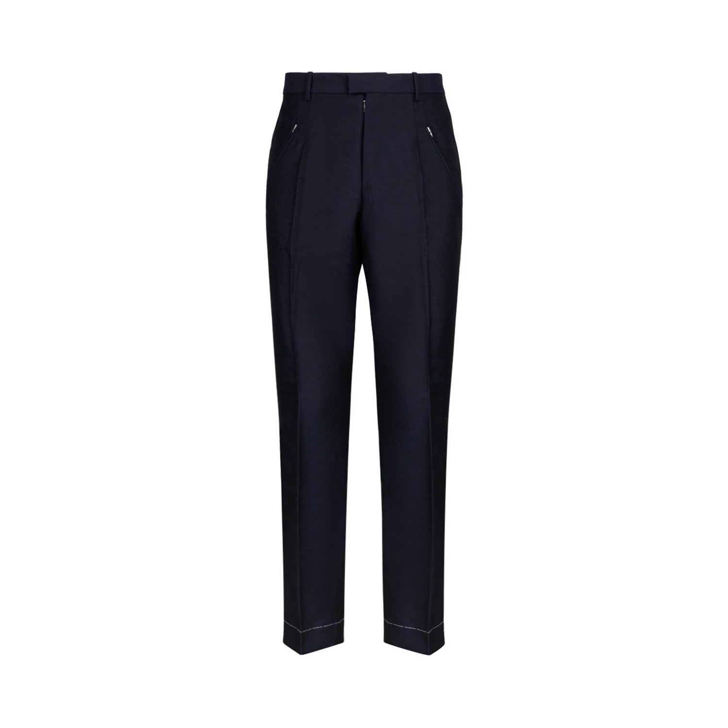 Maison Margiela English Mohair Blu Navy Pants with a central pleat, a contrasting side band and belt loops. The back features a small cut-out, two pockets and the brand's signature Four Stitches.