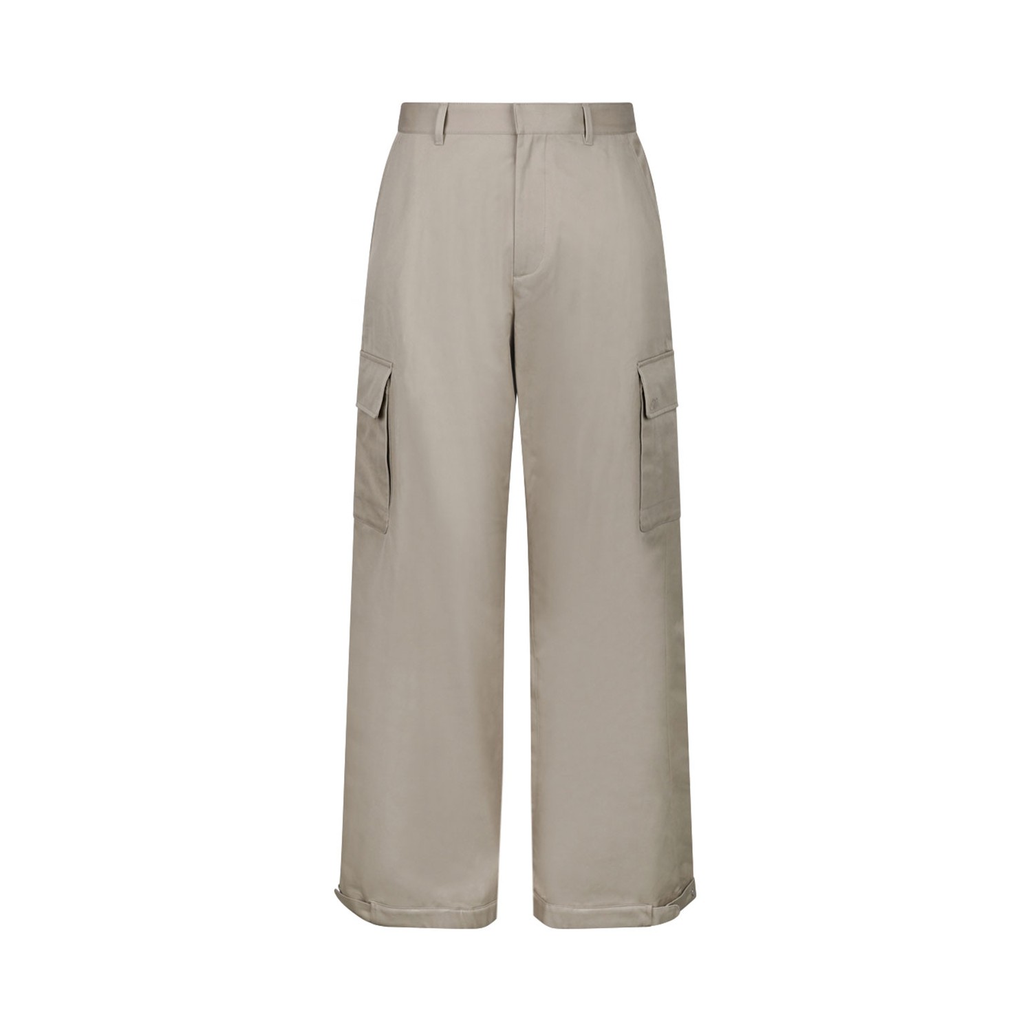 Of White Beige Cargo Trousers. Beige cotton cargo trousers, embroidered log to the side, mid rise, concealed front fastening. Belt loops, slip pockets to the sides, wide leg, two side cargo pockets.