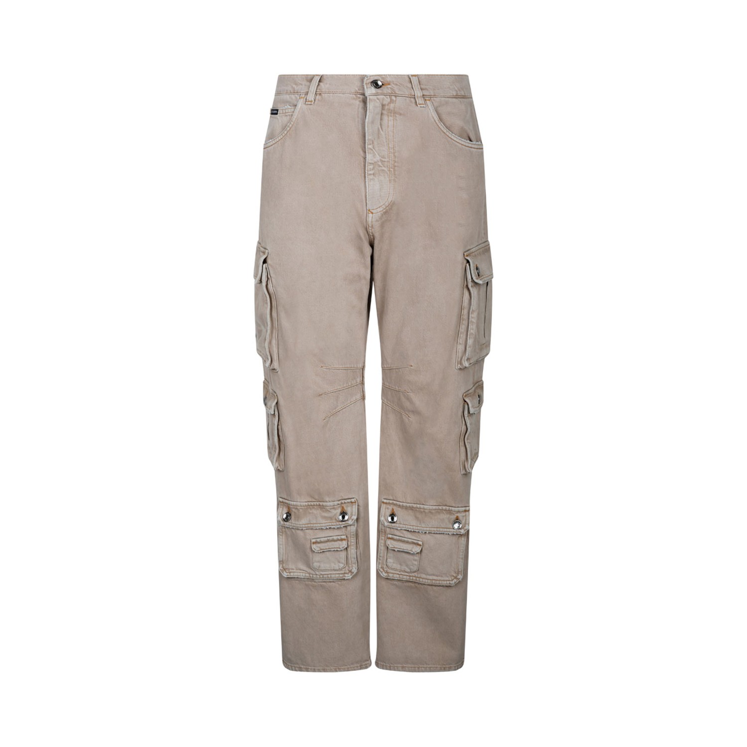 Dolce & Gabbana Beige Cotton Cargo Trousers. Beige cotton cargo trousers, mid rise, belt loops, classic five pockets, gold tone logo plaque, two side cargo pockets, wide leg.