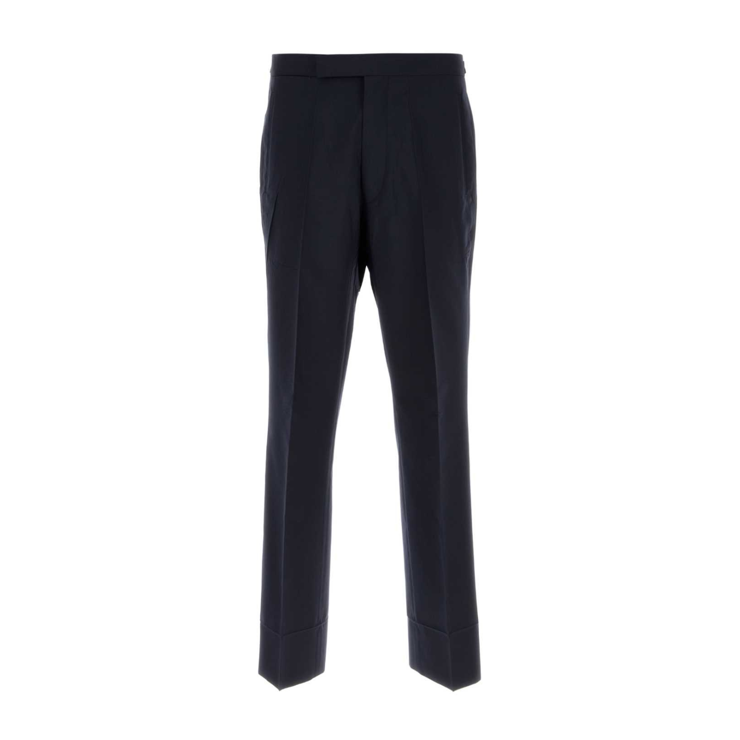 Prada Navy Blue Tailored Trousers. Navy blue trousers with a refined, contemporary silhouette. Trousers crafted in smooth structured fabric for a sharp, elegant finish. Featuring a concealed front fastening, belt loops, side slip pockets, pressed front creases, straight leg and cuffed hems for a sophisticated, timeless look.