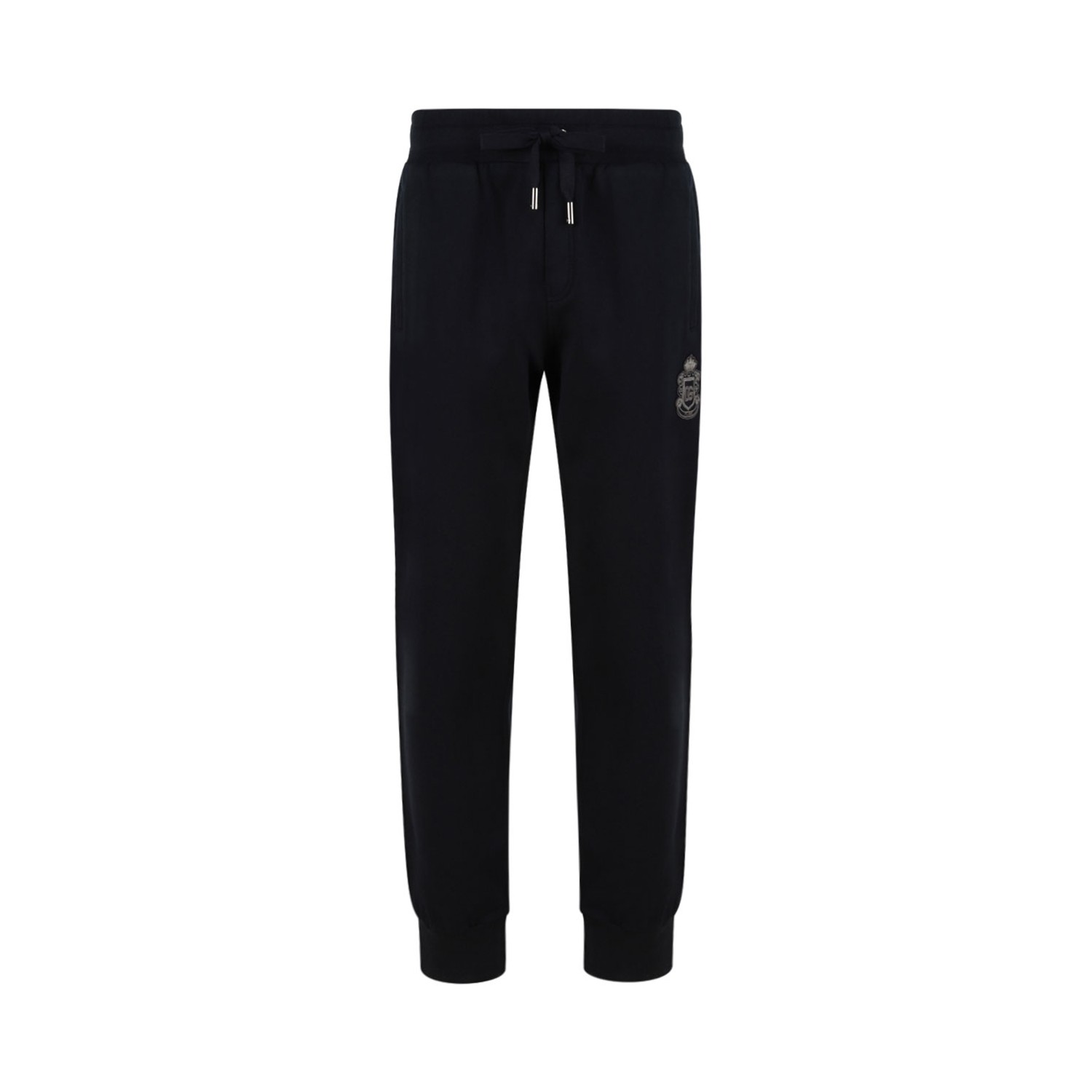 Dolce & Gabbana Dark Blue Emblem Drawstring Track Pants. Dark blue cotton track pants with emblem applique, drawstring fastening, side slit pocket, rear welt pocket and elasticated ankles.
