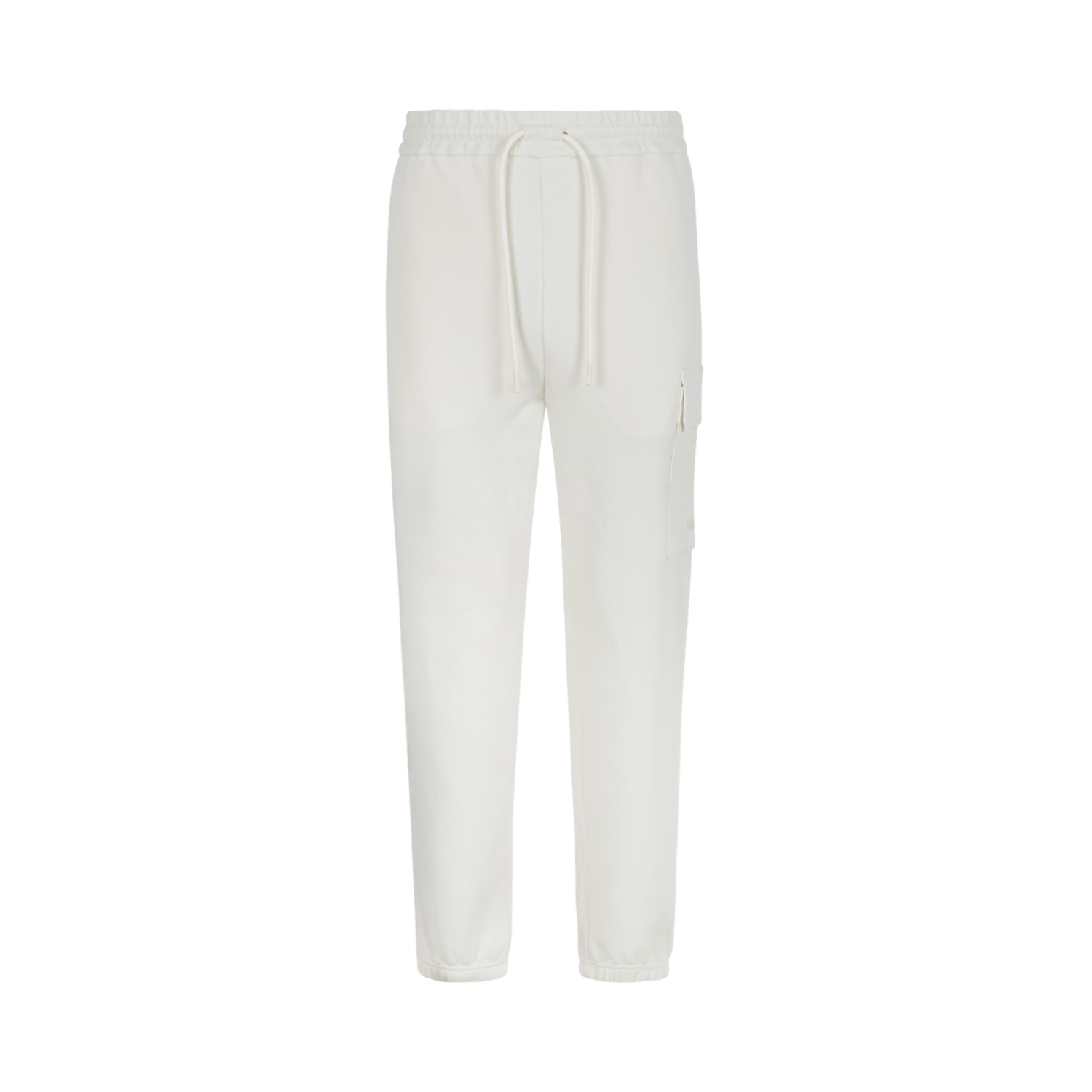 Mackage Cream Cotton Cargo Jogger Pants. Contemporary cream jogger pants defined by a clean, functional silhouette. Crafted from soft cotton fabric, these Mackage trousers feature an elasticated waistband with adjustable drawstring for enhanced comfort and a personalized fit. The tapered leg with ribbed cuffs creates a modern, streamlined profile, while the side cargo pocket adds a practical utilitarian detail. Minimalist construction and subtle branding reflect the brand