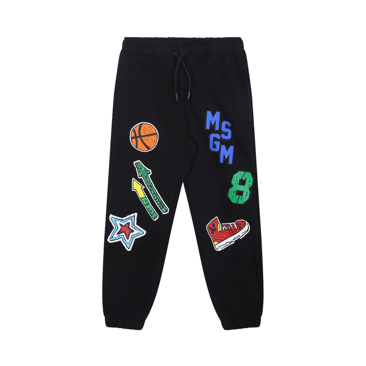 MSGM Kids Black Track Pants. Black cotton pants, jersey texture, logo and illustration-style print at the leg. Two side inset pockets, full-length, elasticated ankles, fleece lining, elasticated drawstring waistband.