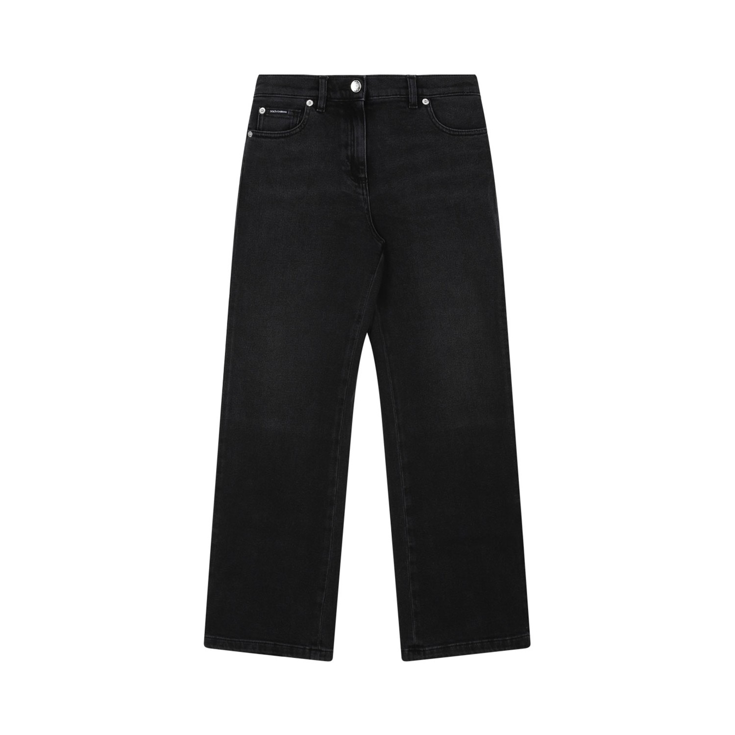 Dolce & Gabbana Kids Black Logo Plaque Jeans. Black stretch cotton jeans, denim, logo patch to the side, logo plaque. Mid rise, front button and zip fastening, classic five pockets, staright leg.
