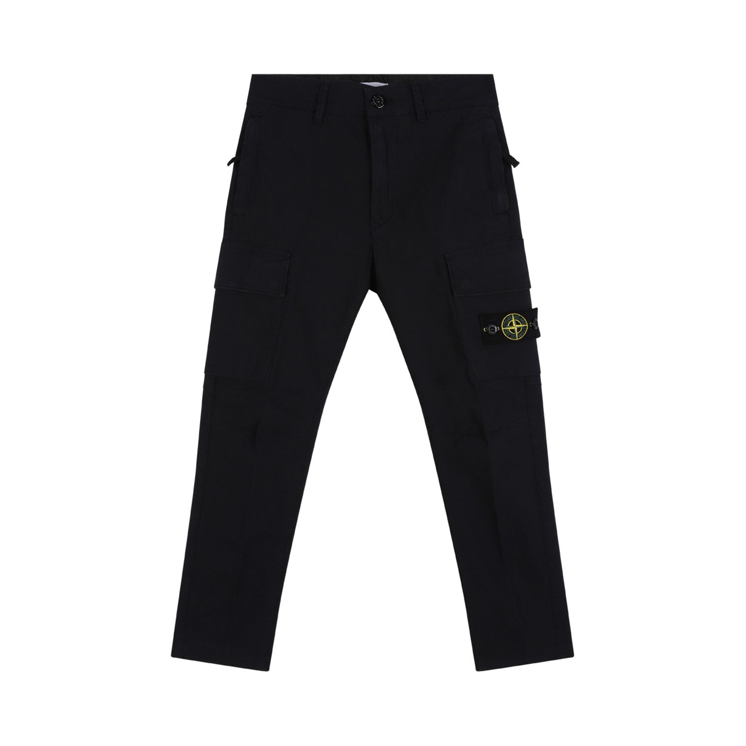 Stone Island Kids Navy Blue Cargo Pocket Trousers. Navy blue cotton blend trousers with logo patch, multiple pockets, concealed zip fastening.